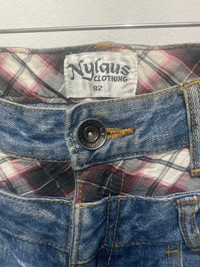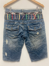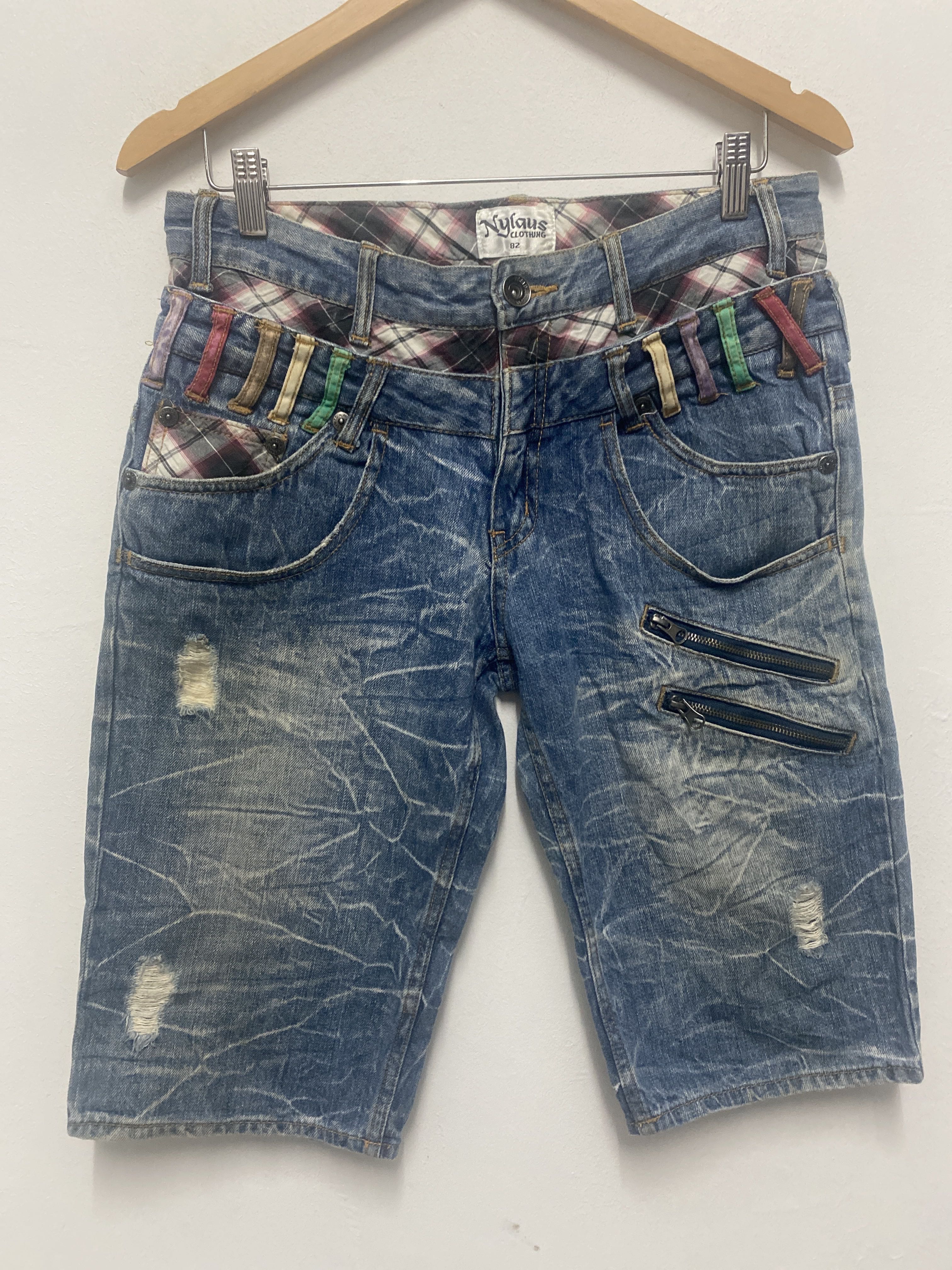 Nylaus Distressed Denim Shorts with Multicolor Belt Loops – Japan Streetwear Style Nylaus Clothing is a Japanese fashion brand known for incorporating playful, creative elements into casualwear. This particular pair of denim shorts represents the Japanese reinterpretation of Western vintage jeans with a mix of Harajuku-inspired flair. The colorful belt loops and tartan flannel lining hint at early 2000s Japanese streetwear culture, where layering, customization, and color play were embraced by youth subcultures. This unique pair of Nylaus denim shorts features a heavily distressed wash with pronounced whiskering and worn patches that give it a rugged, lived-in aesthetic. Standout details include multicolor belt loops and tartan/plaid flannel waistband lining, evoking punk and streetwear influences. With three functional side zippers, it adds a utilitarian touch while maintaining a playful vibe. Perfect for those who love statement pieces in their vintage or Japanese-inspired wardrobe. • Brand: Nylaus Clothing • Size: 82 (approx. M-L waist) Manual waist size: 32 Inseam: 14” Outseam: 23.5” Front rise: 10” Open leg: 8.5” Thigh: 11” • Features: Colorful belt loops, tartan waistband lining, 3 side zip pockets • Style: Japanese Streetwear / Vintage Workwear • Material: Cotton denim • Condition: Pre-owned, distressed by design nylaus denim shorts, japanese streetwear jeans, multicolor belt loops, distressed denim japan, plaid waistband shorts, harajuku jeans, y2k japan fashion, vintage nylaus clothing, unique denim shorts #Nylaus #JapaneseStreetwear #DistressedDenim #HarajukuStyle #VintageJeans #PlaidWaistband #ColorfulBeltLoops #Y2KFashion #RareShorts #StreetwearJapan