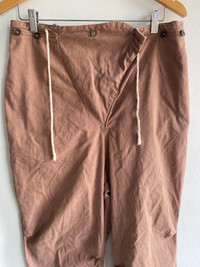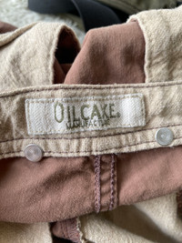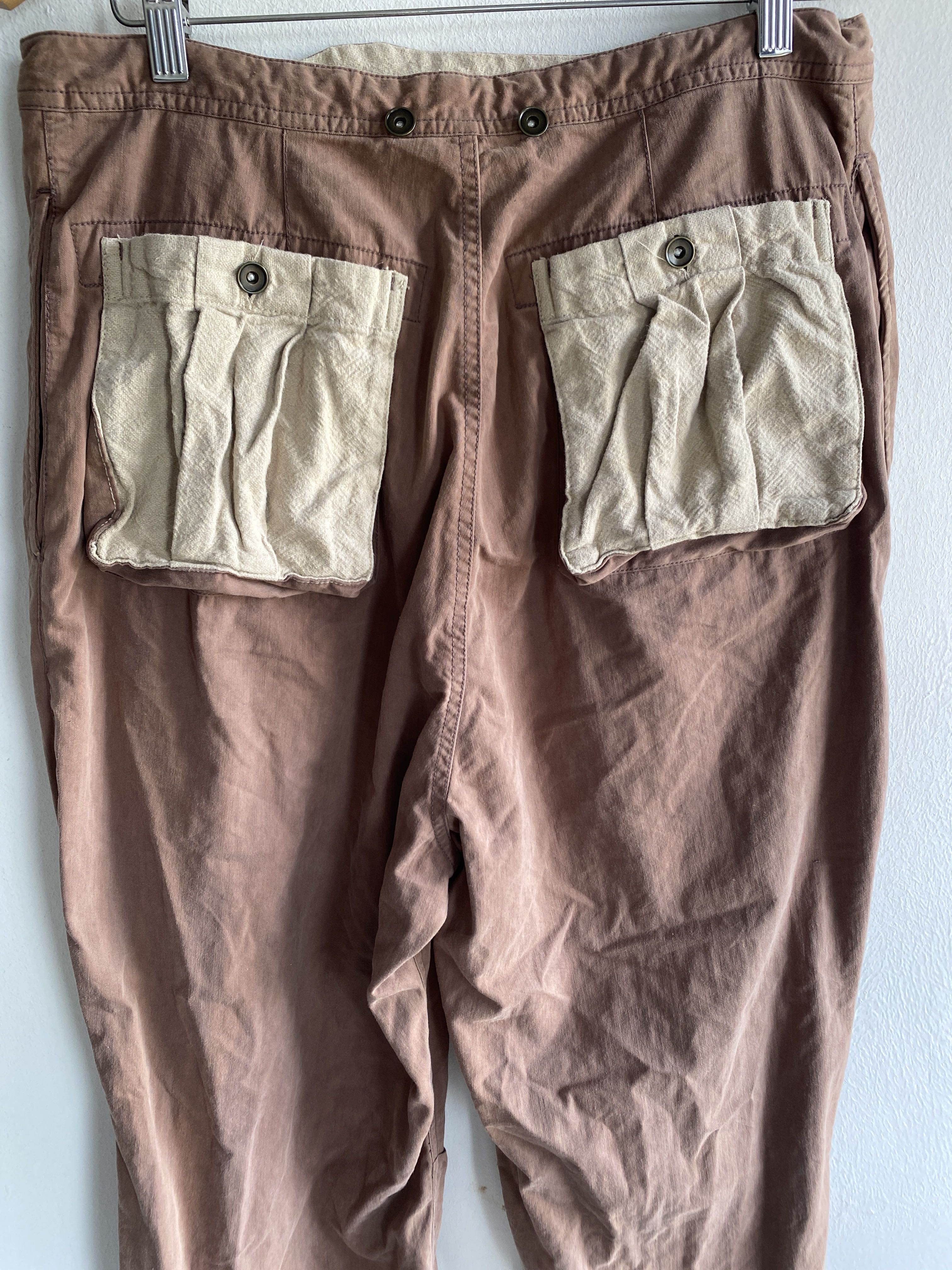 Oilcake Japan Tactical Utility Pants Brown Herringbone Drawstring Cotton Twill Description: Rare vintage-inspired utility pants by OILCAKE Japan, featuring a unique V-shaped front flap with button and drawstring fastening. Constructed from soft herringbone twill cotton in earthy brown tones, with standout contrasting canvas back pockets. Artisanal, military-inspired design with visible wear and texture—perfect for archive or workwear styling. • Brand: OILCAKE Japan • Color: Brown • Material: 100% Cotton (Herringbone Twill) • Details: V-front flap, rope drawstring, contrast canvas back pockets • Size: 30-33, Outseam:43”, inseam: 28”, leg opening: 8”x2=16”, thighs:13”x2=26”, knee: 10”x2=20”, front rise: 15”x2=30”, hips: 20”x2=40” • Made in Japan • Condition: Pre-owned with light wear and natural creasing Great for fans of Kapital, Visvim, Engineered Garments, or vintage Japanese utility aesthetics. Oilcake Japan pants, Japanese utility pants, herringbone cotton trousers, archive workwear pants, V flap trousers, Kapital style pants, rare Japanese brand, artisanal trousers, brown canvas pants, made in Japan pants “Vintage Japanese utility pants with wild back pockets & artisan V-front flap. Never seen these before? That’s because they’re rare. OILCAKE Japan. #RareFind” #OilcakeJapan #JapaneseWorkwear #UtilityPants #KapitalStyle #ArchiveFashion #HerringboneTrousers #MadeInJapan #VintageStyle #RareJapaneseBrand #MenswearArchive
