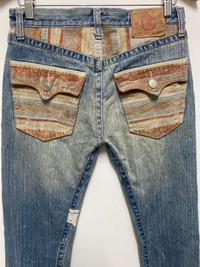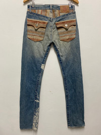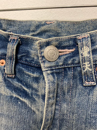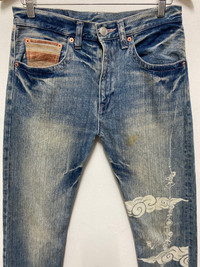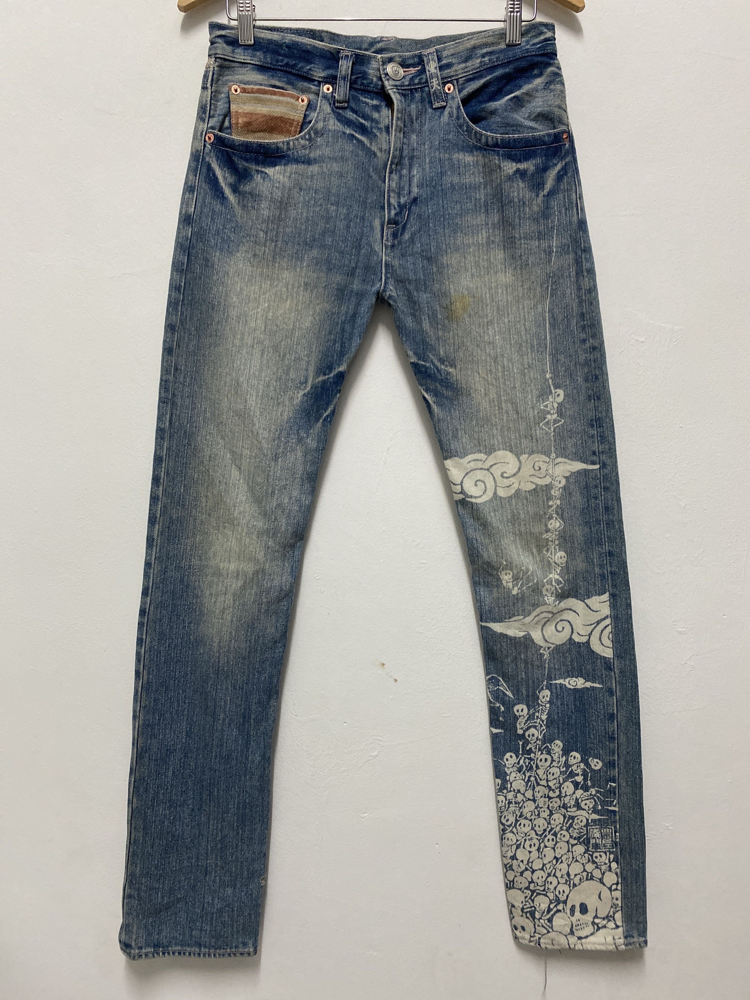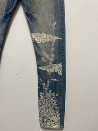 Rare 90s Red Cloud Japanese Denim Jeans with Skeleton Ukiyo-e Print and Blanket Lining These jeans are from Red Cloud, a Chinese denim brand known for producing Japanese-style heritage jeans. This particular pair is likely from the late 1990s to early 2000s, showcasing early examples of East Asian Americana reinterpretation. The design is deeply inspired by traditional Japanese Ukiyo-e art — especially works like Gaki-zōshi (Scrolls of the Hungry Ghosts), evident in the skeleton motif. Red Cloud jeans gained a cult following for using vintage looms, natural indigo dye, and blanket-lined details inspired by 1940s American workwear. This unique pair of jeans features: • A medium vintage wash with whiskering and fading. • One-of-a-kind skeleton & cloud Ukiyo-e-inspired white print covering the front right leg. • Thick blanket lining on the back pockets, coin pocket, and yoke – reminiscent of vintage Levi’s Type 91 or Lee Storm Rider jackets. • Custom metal buttons engraved with Red Cloud’s Chinese crest. • Selvedge denim construction, showcasing a mix of traditional Chinese and Japanese workwear aesthetics. Waist size:30 Outseam: 42” Inseam: 31” Open legs: 6” Front rise: 10” Thigh: 0” Knee: 7.5” Perfect for collectors of rare East Asian denim, vintage enthusiasts, or anyone looking for standout streetwear rooted in deep cultural history. Red Cloud jeans, Japanese denim art jeans, ukiyo-e skeleton jeans, Chinese selvedge denim, vintage blanket lined jeans, rare printed jeans, Asian Americana denim, skull print jeans, collector jeans 90s, limited edition Red Cloud #RedCloudJeans #UkiyoeDenim #SkeletonJeans #VintageDenim #JapaneseWorkwear #AsianAmericana #SelvedgeDenim #HeritageDenim #StreetwearArchive #RareDenimFind