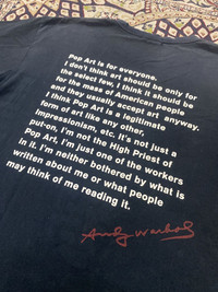 Vintage Andy Warhol Elvis Art Black Tshirt Large Andy Warhol Elvis Presley American Singer Face Over Print Pop Art T shirt Size L BUY WITH CONFIDENCE ! PLEASE, DON'T HESITATE TO MAKE A BEST OFFER _______________________________________ Manual Measurement:- š¹Pit to pit : 22ā inch š¹Length : 27" inch Condition :- š¹Used. Vintage condition. Fading. etc see the pic All measurements are taken with the garment flat on the ground. š¹Colour might be different due to lighting PLEASE REFER TO ALL PICS AND READ ALL DESCRIPTION BEFORE PURCHASE!! _______________________________________ This is used item, pls donāt expect it like new!! IMPORTANT!!If you are buying please send me your phone numberš± I need it for shipping service. Payment via PayPal only RETURN/REFUND All Sales Are Final/ No Refund!! Please contact me with any questions that you may have about this item and our transaction! If you have any problems during or after the transaction contact me first, without opening a case or leaving negative feedback, and it will be solved. ATTENTION Please pay close attention to measurements provided. Do not rely on tag size as pre-worn items may have been altered, stretched or shrunk & vintage sizes do not directly translate the modern sizes. The best way to ensure a correct fit is to compare our measurements with the measurements of a similar item that you know fits you well. And please take note,** i will not accept return if u cant fit it. As i already give my manual measurement. Please enlarge the photo for clearer image. **Please do not expect the shirt in mint condition unless stated. Its because vintage and used items may have sign of wear. " THE JOY OF DRESSING IS AN ART "
