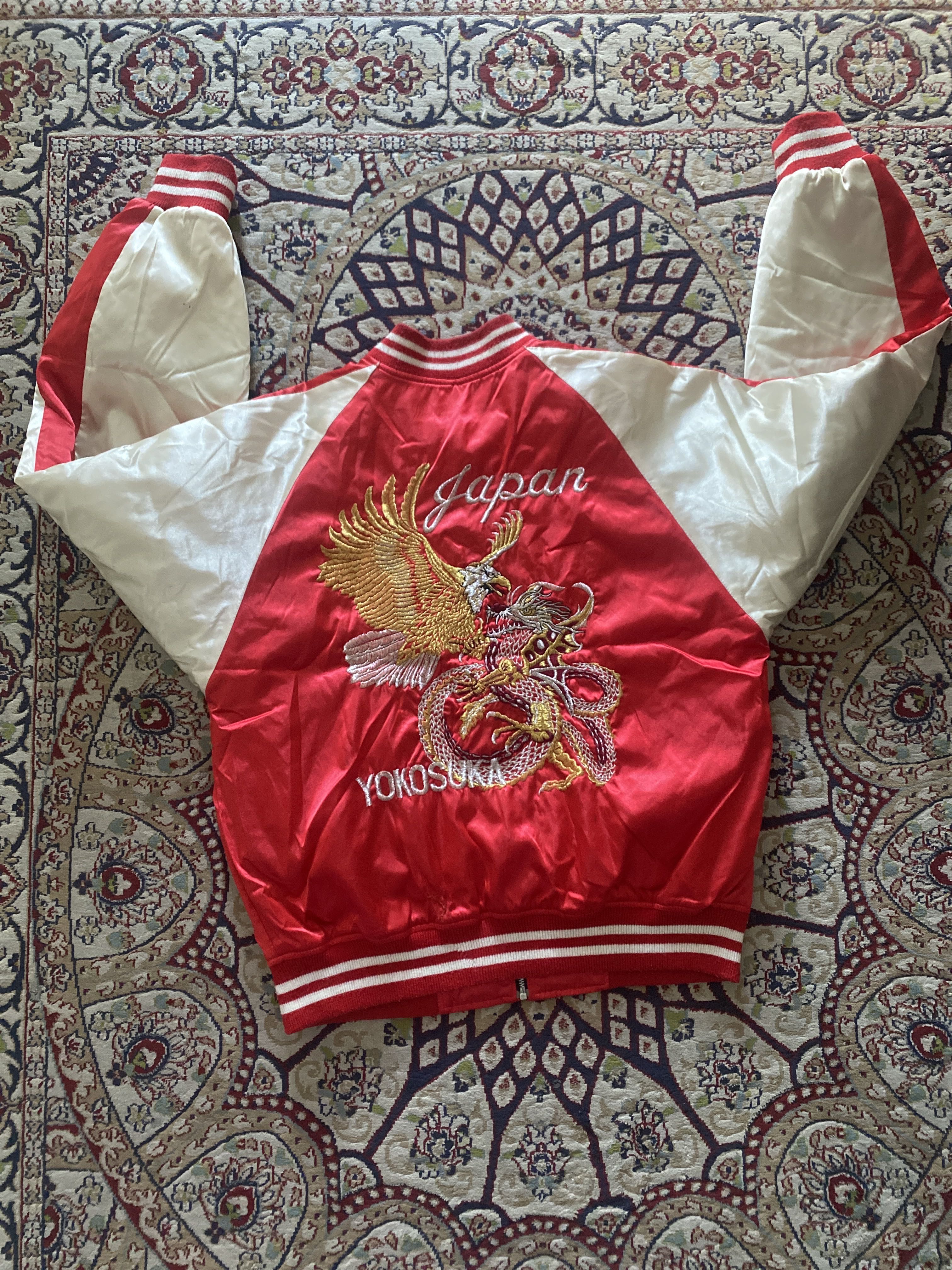 Vintage Sukajan Souvenir Jacket Japan Yokosuka Dragon Phoenix Embroidered Red White Vintage Japanese Sukajan Souvenir Jacket Design: Embroidered Dragon & Phoenix Color: Red & White Size: (Specify if known) Material: Likely Satin (Confirm with touch & feel) Condition: • Good vintage condition with signs of wear • Some repaired stitching and minor damage on the ribbed cuff (see photos) • Faded tag, indicating authenticity and vintage appeal This authentic Yokosuka Sukajan souvenir jacket features beautiful dragon and phoenix embroidery, symbolizing power and rebirth. The satin material gives it a classic vintage look, and the reversible design (if applicable) adds versatility. Sukajan jackets were originally popular among American soldiers stationed in Japan post-WWII and have since become a sought-after fashion piece worldwide. Perfect for: ✔️ Vintage collectors ✔️ Streetwear & Harajuku fashion lovers ✔️ Sukajan enthusiasts ✔️ Japanese culture fans ✅ Vintage Sukajan Jacket ✅ Japanese Souvenir Jacket ✅ Yokosuka Dragon Phoenix ✅ Embroidered Bomber Jacket ✅ Rare Japan Jacket ✅ Men’s Streetwear ✅ Harajuku Fashion ✅ 90s/80s Japan Jacket ✅ Satin Bomber Jacket ✅ Collectible Sukajan #Sukajan #VintageSukajan #JapanJacket #Yokosuka #DragonJacket #PhoenixJacket #BomberJacket #JapaneseFashion #HarajukuStyle #Streetwear #SatinJacket #RareFind #Grailed #eBaySeller #MensFashion #JapaneseCulture