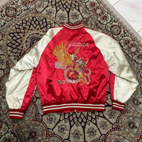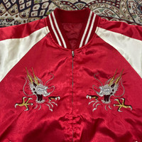 Red and white embroidered dragon bomber jacket Pit/ chest: 23”in Length: 23.5”in Sleeve length: 32”in A little defect, please refer a picture A little stain Sale are final