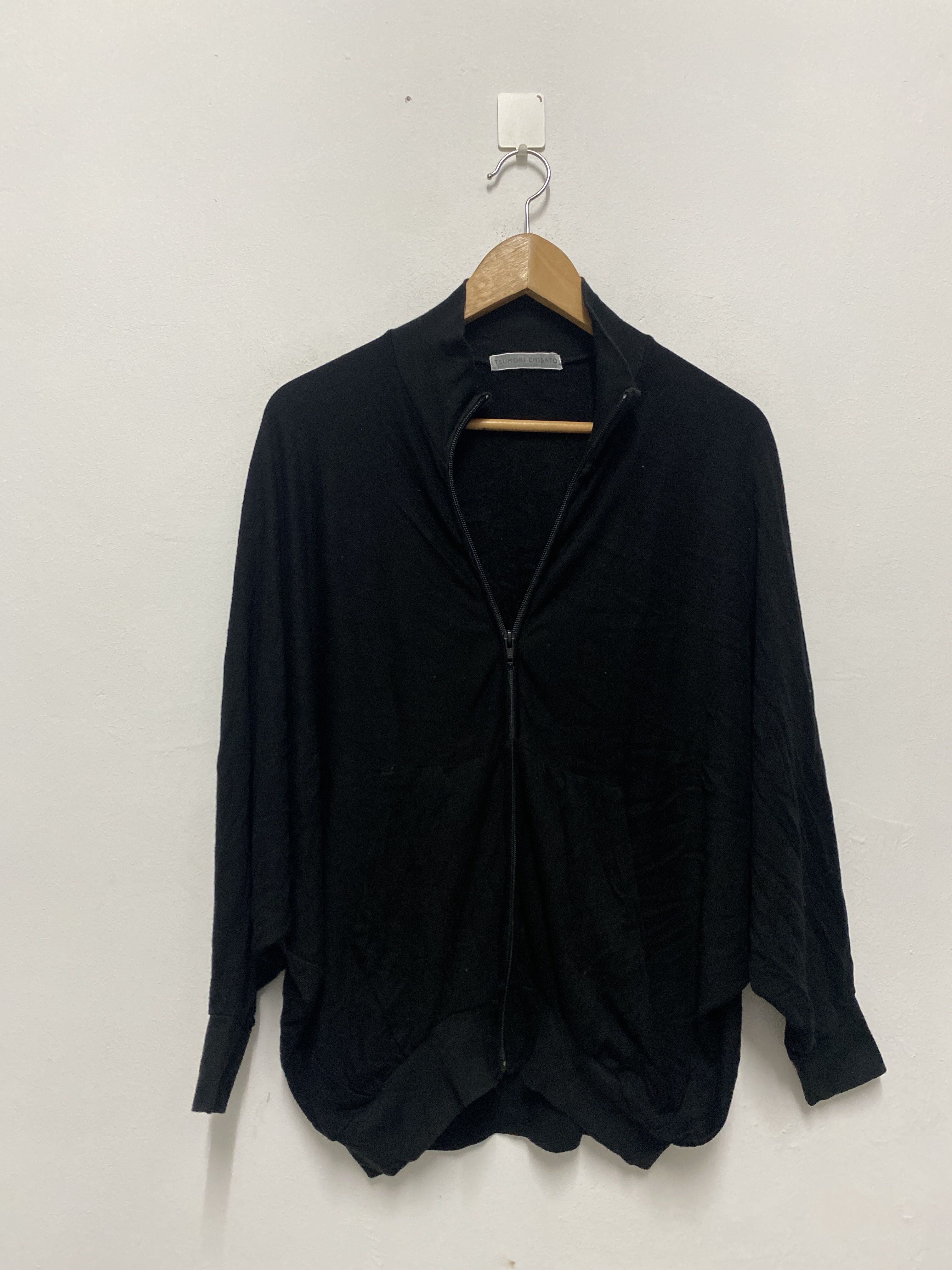 Tsumori Chisato Black Batwing Zip-Up Cardigan Tsumori Chisato, a celebrated Japanese designer and former protégé of Issey Miyake, is renowned for her whimsical, artistic, and often avant-garde designs. This piece reflects her signature relaxed silhouette combined with subtle Japanese aesthetics. While many of her works are known for bold prints, this minimalist black piece showcases her versatility in working with texture, shape, and movement. A rare minimalist black cardigan by Tsumori Chisato featuring a batwing/dolman sleeve cut, front zip closure, and wide ribbed cuffs and hem. Constructed from a lightweight fabric with a soft drape, the relaxed fit adds an avant-garde touch while maintaining comfort and function. A quiet yet artistic expression of Japanese fashion ideal for layering or as a standout piece in a minimal wardrobe. • Brand: Tsumori Chisato • Color: Black • Features: Front zipper, kangaroo pockets, batwing sleeves, ribbed hem & cuffs • Material: Lightweight cotton blend (assumed – please verify fabric content) • Size: (Please confirm actual tag or measurements) Tsumori Chisato cardigan, Japanese designer fashion, batwing sleeve jacket, minimalist Japanese clothing, rare Tsumori Chisato zip-up, avant-garde fashion, Japan streetwear layering, Issey Miyake protégé style #TsumoriChisato #JapaneseFashion #AvantGardeStyle #MinimalistWardrobe #DesignerCardigan #BatwingSleeves #RareFind #IsseyMiyakeSchool #TokyoFashion #ZipUpLayering