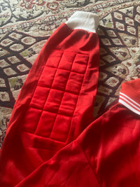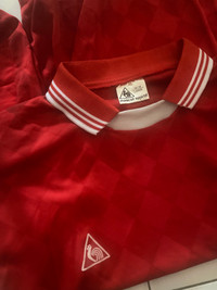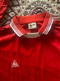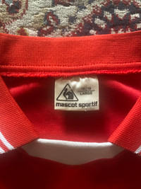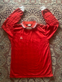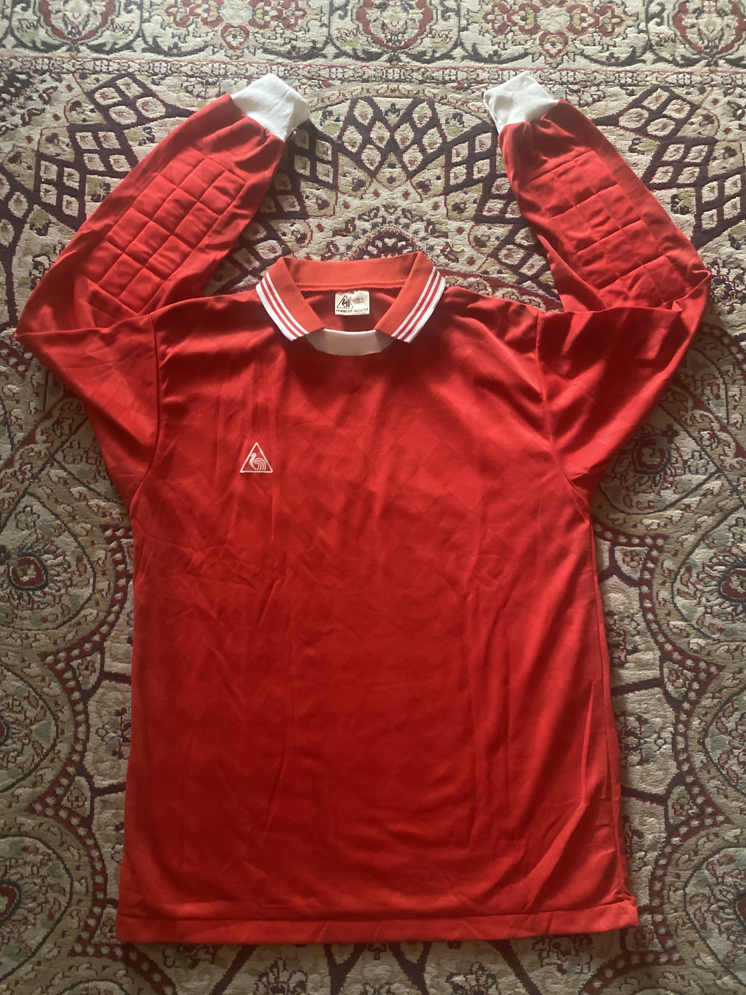 Vintage 1980s Mascot Sportif Goalkeeper Jersey - Red Padded Long Sleeve Throwback to the golden age of football with this rare Mascot Sportif goalkeeper jersey in a vibrant red. Featuring iconic quilted padding on both sleeves for elbow protection, this piece blends performance with classic style. The collar is designed with double white stripes and a white insert, adding a timeless vintage flair. Worn by keepers who commanded the box with presence and pride, this jersey is a collector’s piece for football nostalgists or retro sportswear lovers. Details: • Size: Large (Tag: 18/19), C20”L27” • Color: Red with white accents • Material: Likely polyester (tag not fully shown) • Features: Padded elbows, long sleeves, vintage rooster triangle logo • Tag reads: “Mascot Sportif” – a rare and lesser-known vintage European or UK brand • Washing instructions: Hand-hot wash (40-45°C), wash dark colours separately Vintage goalkeeper jersey, retro football shirt, mascot sportif jersey, padded long sleeve keeper kit, classic 80s soccer top, rare football memorabilia, red goalkeeper kit, 1980s football jersey, retro sportswear, old school goalie shirt #VintageGoalkeeperJersey #MascotSportif #RetroFootball #80sFootballKit #FootballHeritage #ClassicSoccerShirt #GoalkeeperStyle #RareFootballJersey #VintageSportswear #PaddedSleeveJersey