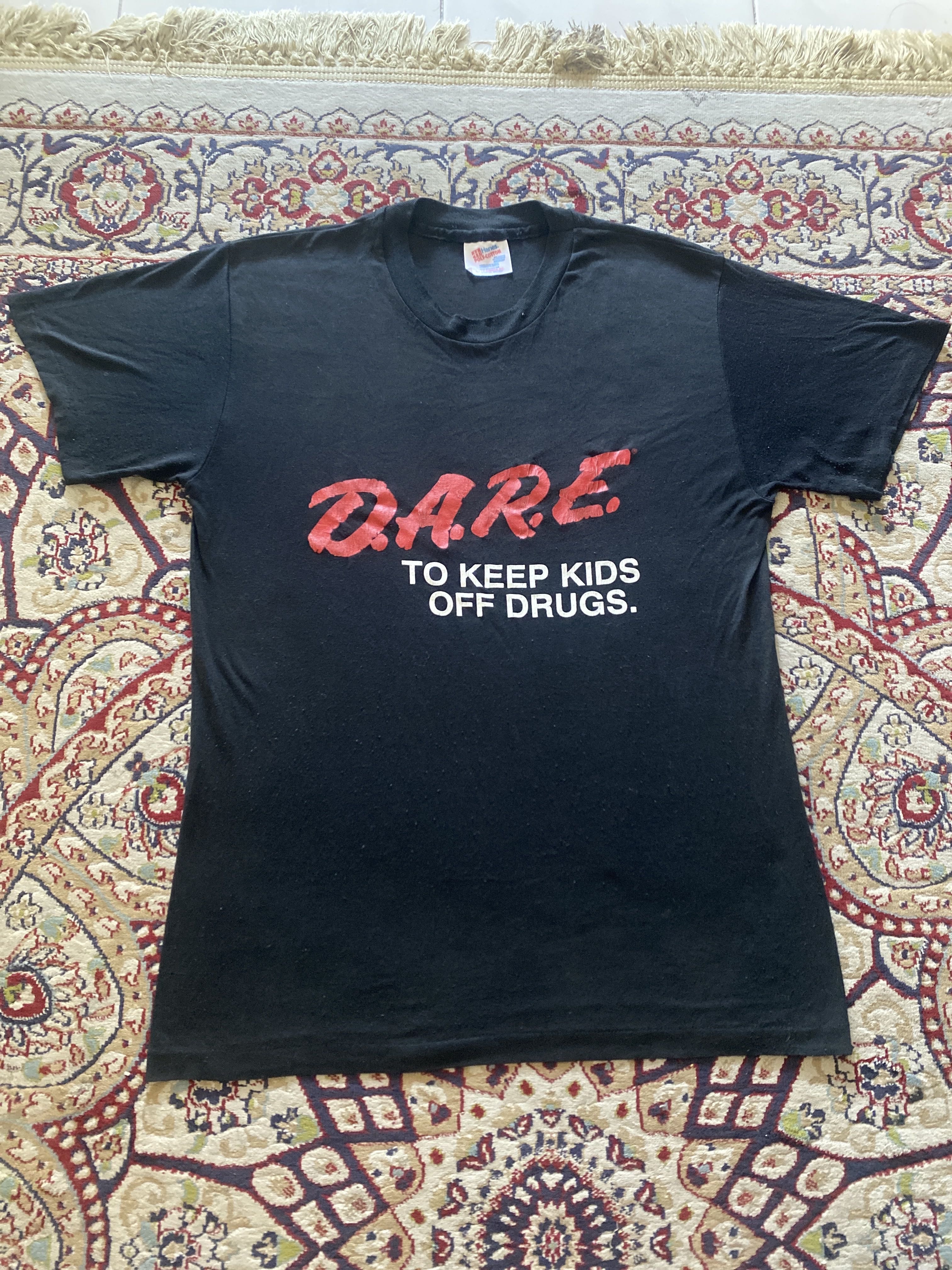 Vintage 90s D.A.R.E. T-Shirt Hanes Poly Cotton Black Medium Keep Kids Off Drugs This is a vintage 1990s D.A.R.E. (Drug Abuse Resistance Education) T-shirt made by Hanes. It features a classic black color with bold red and white “D.A.R.E. TO KEEP KIDS OFF DRUGS” graphic on the front. The shirt is made from a comfortable poly-cotton blend and has a tag size Medium. Perfect for vintage collectors, streetwear enthusiasts, and those who appreciate anti-drug campaign memorabilia. • The D.A.R.E. program was popular in the late 80s and 90s as a drug prevention initiative. • Hanes poly-cotton blend shirts from the 90s are highly sought after for their softness and durability. • Vintage D.A.R.E. shirts have gained popularity in the streetwear and nostalgia markets. vintage dare shirt, 90s dare tee, hanes poly cotton, black dare t-shirt, keep kids off drugs shirt, vintage streetwear, dare program shirt, 90s nostalgia tee #VintageTee #DareShirt #90sFashion #Streetwear #HanesTShirt #VintageClothing #KeepKidsOffDrugs #ThrowbackFashion