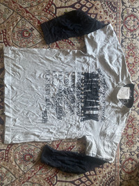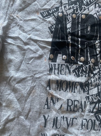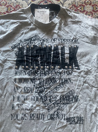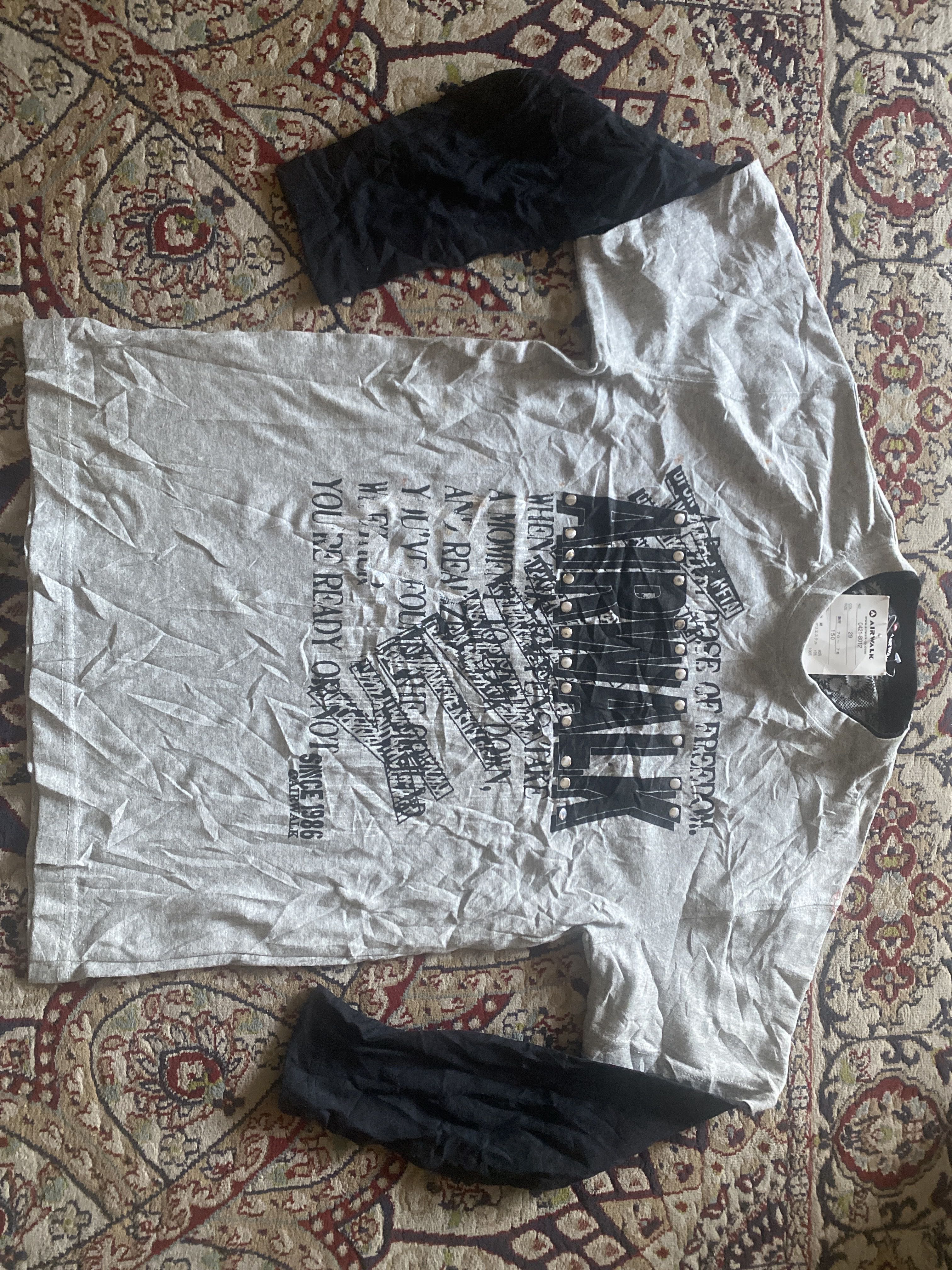 Vintage AIRWALK Studded Graphic Long Sleeve T-Shirt – “Dose of Freedom” Grey/Black Founded in 1986, AIRWALK is a legacy skate and streetwear brand from the U.S. that gained massive popularity during the 1990s and early 2000s. This particular shirt is a Japan-exclusive piece (as seen from the Japanese sizing tag), featuring a punk-inspired print, metal studs, and an extended sleeve design. It’s a representation of AIRWALK’s rebellious skate culture influence in the Japanese fashion scene. This rare AIRWALK long sleeve T-shirt features a bold distressed typography graphic across the chest reading “DOSE OF FREEDOM” and “YOU’RE READY OR NOT,” with large AIRWALK lettering detailed with metal rivet studs. The sleeves are black, creating a layered visual effect over the grey body. Key details: • Size 150 (Japan youth L / men’s XS-S US) Chest:19” Length:24.5” • Text-heavy design with mixed fonts • Since 1986 branding on the lower hem • Black long inner sleeves for a grunge/punk look Condition Notes: • Visible rust/brown stains (front and back) • Small hole near the back hem • Minor fabric wear A piece perfect for collectors or for upcycling and reworking. AIRWALK vintage tee, Japanese AIRWALK shirt, studded AIRWALK shirt, skate brand Japan, AIRWALK since 1986, punk streetwear tee, grunge long sleeve shirt, grey black layered tee, Japanese skate culture clothing, vintage AIRWALK Japan #AIRWALK #VintageSkatewear #GrungeFashion #StuddedTee #StreetwearJapan #PunkStyle #SkaterLook #1986AIRWALK #LayeredLook #japanesestreetwear