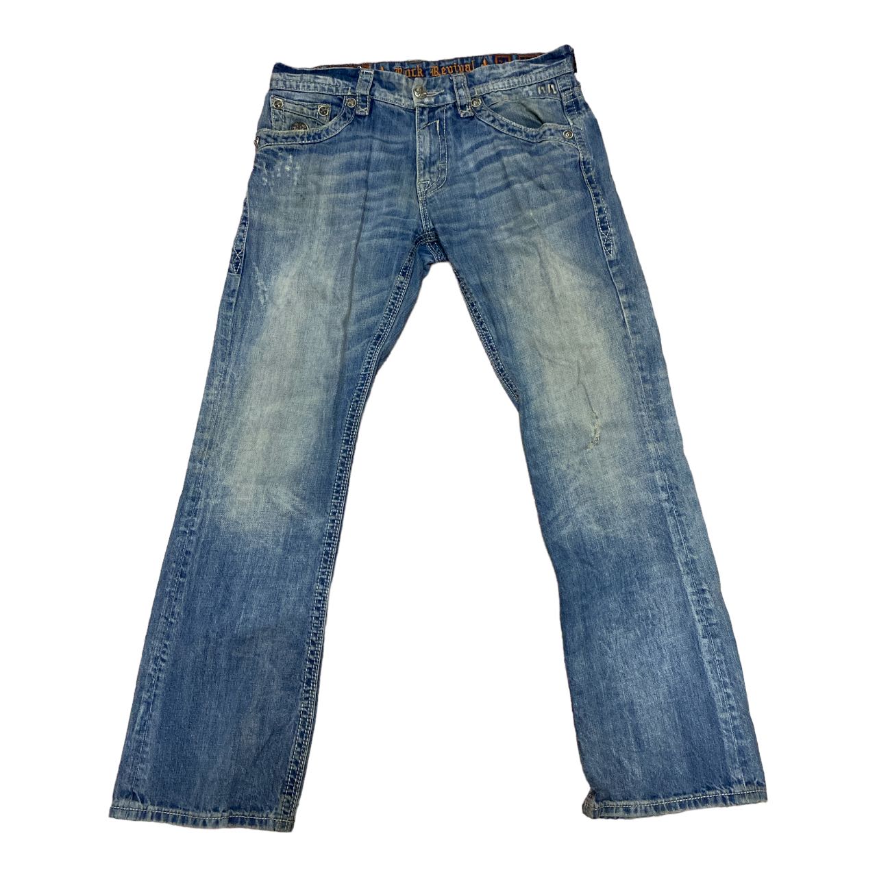 Crazy Vintage Rock Revival Jeans designed for Buckle Selvedge Distressed W38 Manual waist size:38 Outseam: 44”in Inseam: 34”in Open leg: 10”in Thigh: 13”in Knee: 10”in Front rise: 11”in Hip: 23”in