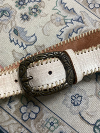 Vintage SCOOTER Hand-Stitched Leather Belt Western Cowboy Style White Brass Buckle Upgrade your wardrobe with this vintage SCOOTER leather belt, featuring a hand-stitched design and an elegant western-style brass buckle. The belt is crafted from genuine leather (or faux leather if applicable) with a unique off-white color, making it a standout piece for casual or cowboy-inspired outfits. Features: ✔️ Brand: SCOOTER ✔️ Material: Leather (verify if genuine or faux) ✔️ Color: Off-White / Cream ✔️ Hand-Stitched Edges for Durability & Style ✔️ Vintage Western/Cowboy Aesthetic ✔️ Metal Buckle with Engraved Details ✔️ Ideal for Casual, Western, or Vintage Fashion Condition: Pre-owned, in good vintage condition with signs of wear consistent with age. (Adjust condition details as needed.) Size: (manual waist size:34, actually size; 32-26, long: 40”, width: 1.4”) SCOOTER is a lesser-known vintage brand, but hand-stitched leather belts, especially western or cowboy-style designs, are highly sought after by collectors and fashion enthusiasts. The brass buckle detailing adds a premium look, making it attractive to those who appreciate vintage western accessories. Vintage Leather Belt, Hand-Stitched Belt, Western Style Belt, Cowboy Belt, Brass Buckle Belt, Retro Leather Belt, SCOOTER Belt, White Leather Belt, Rodeo Belt, Men’s Vintage Accessories #VintageBelt #LeatherBelt #WesternStyle #CowboyBelt #HandStitched #SCOOTERBelt #BrassBuckle #RetroFashion #VintageAccessories #MensStyle