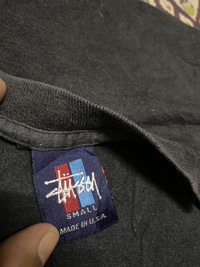 Stussy Black T-Shirt with Small Logo (Small) A black Stussy T-shirt featuring a small embroidered logo on the left chest. The logo includes a red, white, and blue color scheme. The shirt is in size small and made in the USA. It is made from 100% cotton and comes with standard care instructions to machine wash cold, avoid bleach, and tumble dry low. This design is a minimalist approach, with the focus on the small, embroidered logo. Stussy is known for producing streetwear with both bold and subtle designs, and this shirt falls under the latter category. The classic black color makes it versatile for different outfits, and the simple logo adds a premium touch. Stussy, black T-shirt, small logo, embroidered, minimalist, streetwear, USA-made, cotton, classic fashion, casual. Chest: 17.5” Length:26” Sale are final