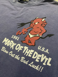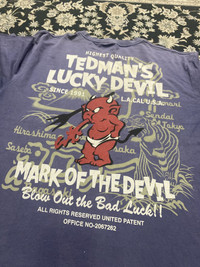 Vintage Tedman’s Lucky Devil Mark of the Devil 1991 T-Shirt Japan This is a rare Tedman’s Lucky Devil “Mark of the Devil” graphic t-shirt from 1991. Made in Japan, this tee features a bold red devil mascot on both the front and back, with intricate Japanese-inspired graphics and text. The phrase “Blow Out the Bad Luck!!” is printed prominently, symbolizing good fortune. • Brand: Tedman’s (Ted Company) • Material: 100% Cotton • Color: Faded Blue / Purple • Size: (42, chest: 21.5”in, length: 26.5”in) • Condition: (Mention any flaws, fading, or wear) • Made in Japan A perfect addition for collectors of vintage Japanese streetwear, Harajuku fashion, or Tedman’s enthusiasts. Tedman’s (also known as Ted Company) is a Japanese brand famous for its “Lucky Devil” character, which represents good luck despite its mischievous devilish appearance. The brand has gained cult status among vintage clothing fans and Americana-style enthusiasts in Japan. Tedman’s Lucky Devil T-Shirt, Ted Company Vintage Tee, Mark of the Devil Japan, Japanese Vintage Streetwear, Harajuku Graphic Tee, Tedman’s 1991 Shirt, Rare Tedman T-Shirt #Tedmans #LuckyDevil #VintageTee #JapaneseStreetwear #MarkOfTheDevil #HarajukuFashion #RareFind #TedCompany #AmericanaStyle #1990sFashion Sku:R1446H