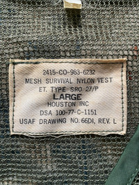 Vintage Houston USAF Military Army Vest 1977 2415-CO-983-6232 ET.TYPE SRO 27/P Houston inc Usaf Drawing No.66DI, REV.L DSA 100-77-c-1151 Size on tag: large Chest: 21.5” in Length: 22” in Sale are final Sku: punk