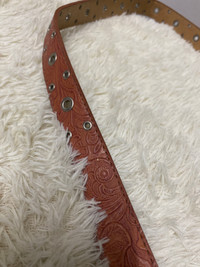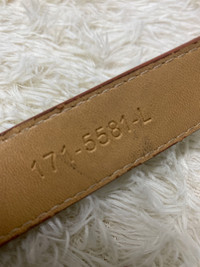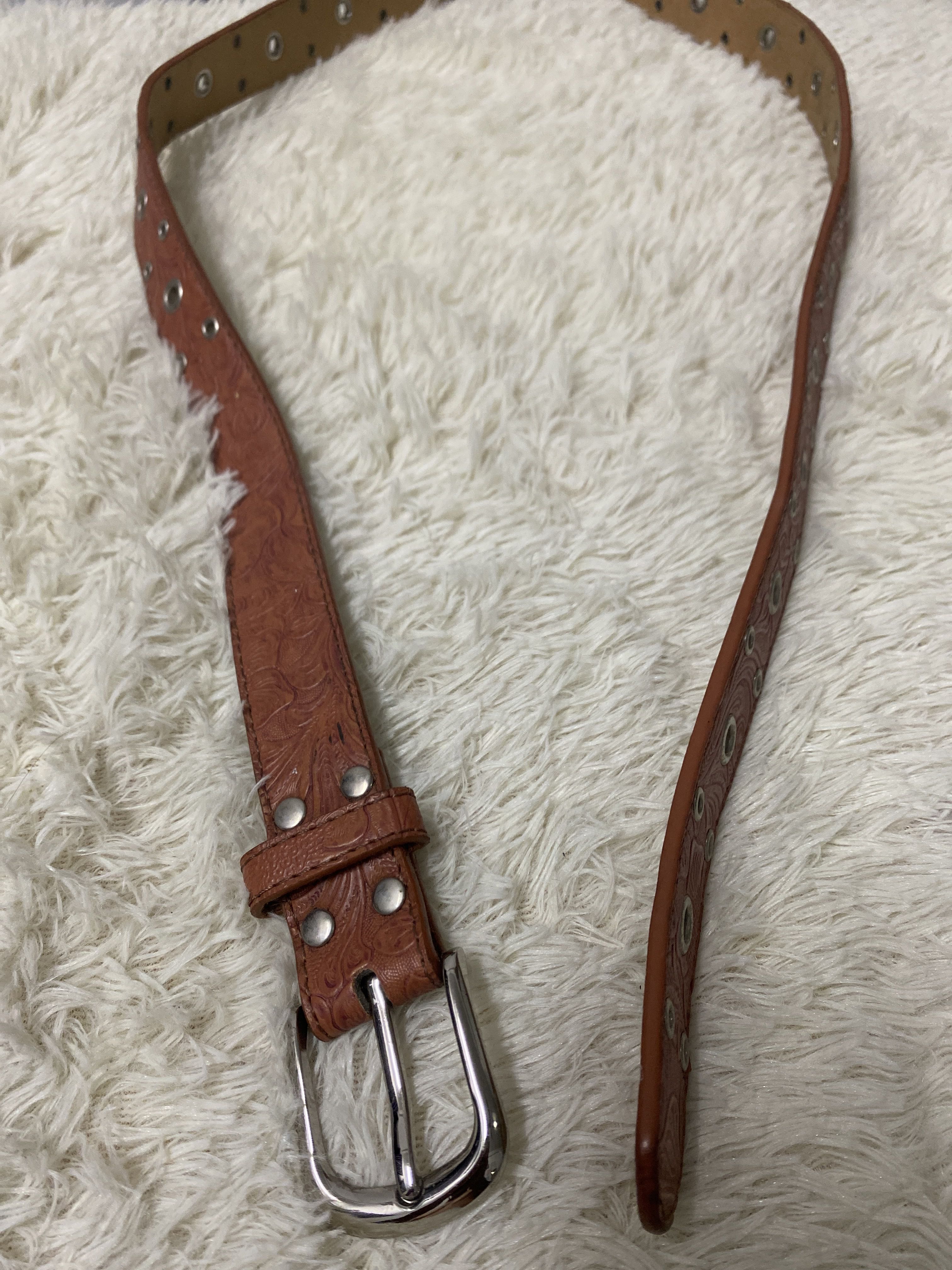 Vintage Western Tooled PVC Belt Brown Double Prong Silver Buckle - Size L This is a vintage Western-style tooled pvc belt in brown, featuring an intricate embossed paisley pattern and metal grommet details. The belt has a sturdy silver-toned double prong buckle and is marked with the code “171-5581-L” on the inner side, indicating its size (Large). A perfect accessory for cowboy, biker, or vintage fashion enthusiasts. Condition: • Pre-owned with visible wear and signs of aging. • Some areas show wear and slight peeling, but the belt remains structurally solid. • The buckle has minor scuffs but is fully functional. Measurements: • Length: [46.5”] • Width: [1”] Tooled leather belts are popular in Western and vintage fashion due to their detailed craftsmanship and durability. These belts are often handmade, with patterns pressed or carved into the leather to create a unique aesthetic. The grommet design adds a rugged and stylish touch, often favored in cowboy and biker fashion. vintage leather belt, tooled leather belt, Western belt, cowboy belt, biker belt, embossed leather belt, silver buckle belt, vintage accessories, retro fashion, 90s style belt #VintageFashion #TooledLeather #WesternBelt #CowboyStyle #BikerGear #RetroAccessories #SilverBuckle #MensFashion #LeatherGoods #ClassicStyle