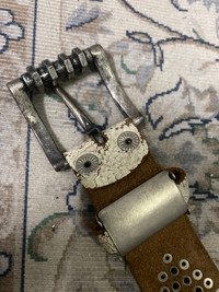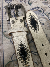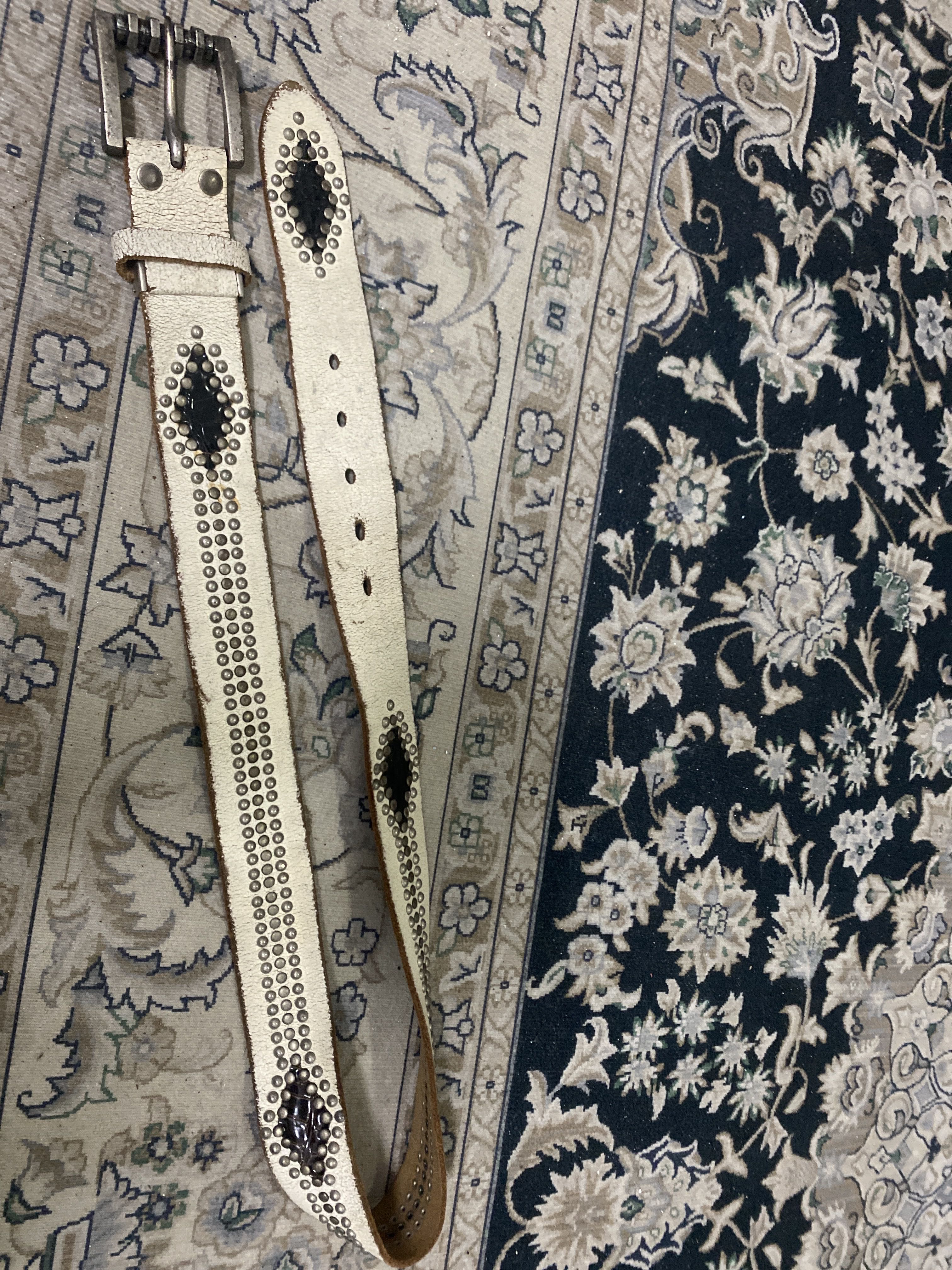 Vintage White Leather Studded Belt with Ornate Metal Buckle - Western Rock Punk Style W34 This is a vintage white leather belt featuring an eye-catching studded design with black diamond-shaped embellishments. The belt has a distressed look, giving it a unique character and rugged appeal. The metal buckle is heavy-duty with a worn, aged patina, adding to its vintage aesthetic. Ideal for rock, punk, and western fashion styles. • Material: Genuine leather • Color: White with black accents • Studded design with metal embellishments • Heavy-duty metal buckle with a rustic finish • Width: Standard belt width • Condition: Vintage, with visible wear and patina on the leather and metal hardware • Suitable for casual, rock, punk, and western-inspired outfits This type of belt is often associated with vintage western, rock, and punk fashion styles. Brands like Chrome Hearts, 1970s-1980s biker brands, and high-end designer labels have created similar studded leather belts. The distressed leather and patina on the buckle suggest an authentic aged look, making it a desirable accessory for collectors and fashion enthusiasts. Sku:R1446H