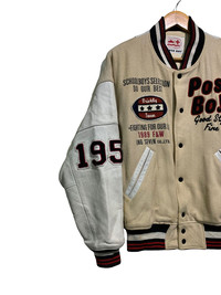 🔥VTG POSH BOY VARSITY JACKETS WOOL AND LEATHER SLEEVES SIZE L MADE IN JAPAN CONDITIONS GENTLY USED COLOUR WHITE AND CREAM CODE: GK 2