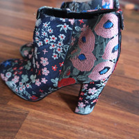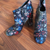 Sam Edelman size US womens 8.5 what is im guessing a brocade or jacuqard type of floral fabric on the bootie shoes. The heeled boots are super cute and i think i wore them once soo long ago so they're in great shape. they need a loving home. moderate creasing at vamps.