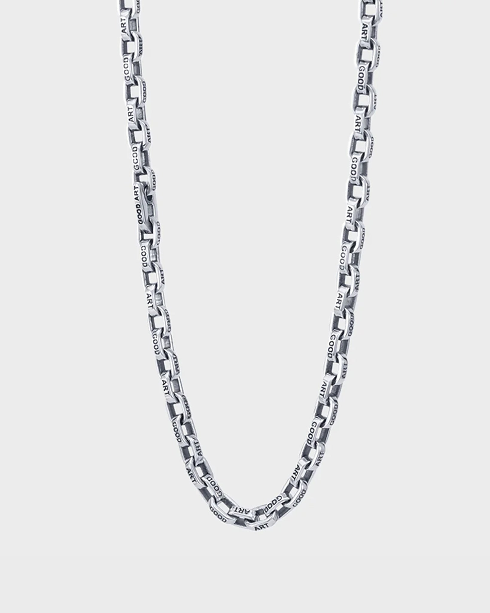 This tiny handmade chain punches above its weight class. This is one of those studies in doing what you want instead of what's fiscally clever. This is a small link to cast and make by hand. The vast majority of small chains are made by machines with high tolerances and low cost, pushing sterile links of pseudo-aesthetics from their bottom holes. That's not what Josh Warner was after with this piece, or any. Made by GOOD ART HLYWD Handmade jewellery from the USA, designed by Josh Warner and crafted at The Foundry in Los Angeles. GOOD ART HLYWD Pequeno A Mano Necklace - Sterling Silver - .925 Sterling Silver - 'Good Art' embossed links