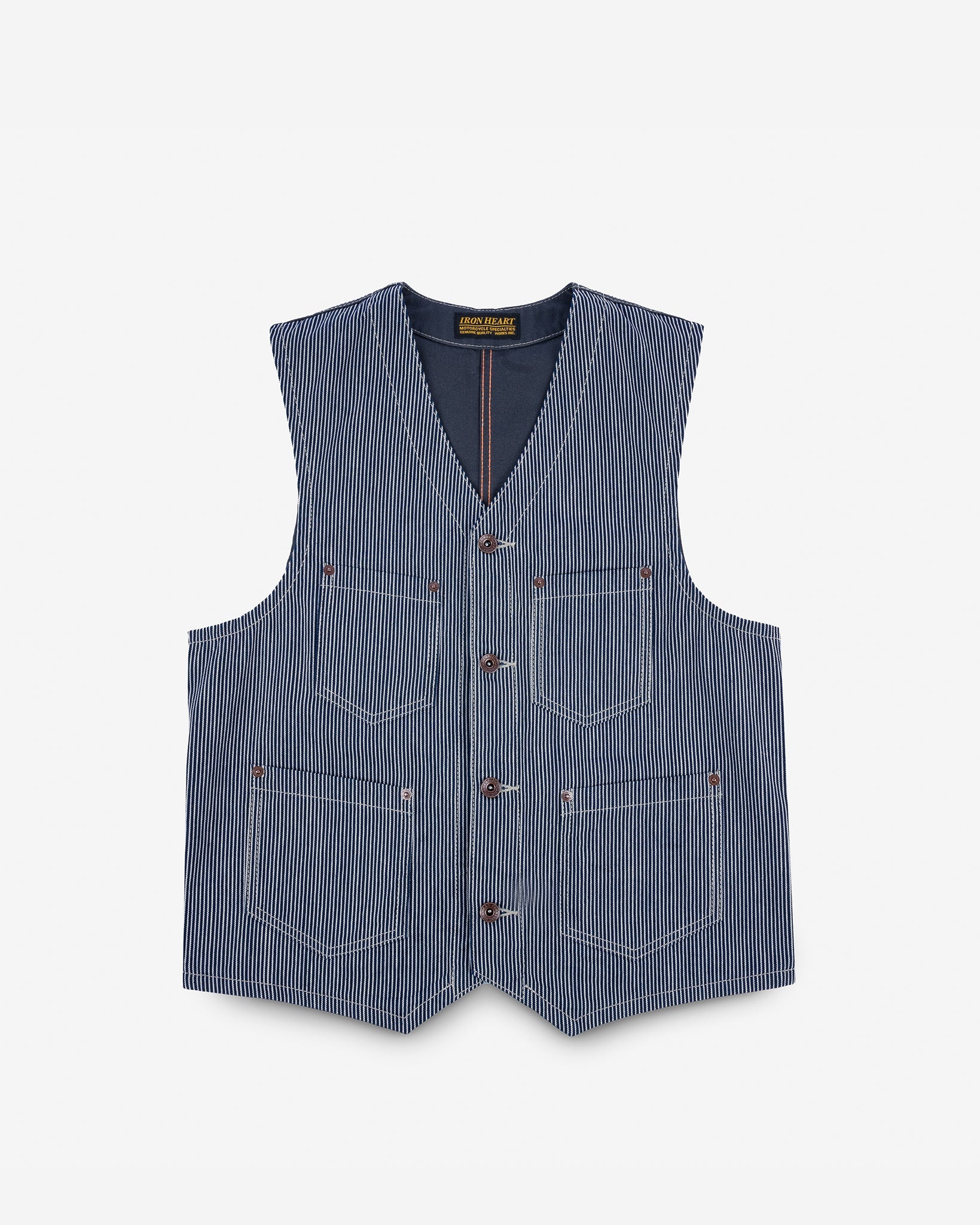 Our traditional work vest, crafted from 10.5oz narrow hickory stripe cloth and backed with a grey cotton duck canvas. With its origins dating back to the 1800s, hickory stripe is a fabric synonymous with vintage workwear. This authentic weave features a narrower stripe, emphasising the indigo-dyed warp yarns which will fade and evolve as the garment ages. With features including four pockets, copper hardware and a buckled cinch, this is a versatile year-round layering piece which delivers true heritage style. Made In Japan - Designed by Shinichi Haraki, handmade by WORKS INC. in Japan 10.5oz Narrow Stripe hickory - 10.5oz Japanese hickory stripe - 100% cotton - Indigo dyed warp / natural weft - will fade with wear and washing - White stitching Features & Construction - Two chest pockets - Two waist pockets - Iron Heart branded tack button fastenings - Cotton duck back - Rear buckle cinch - Copper reinforcement rivets - Felled seams throughout Model Sizing Model Sam is wearing Large One-Washed - Post construction, we wash the completed garment in an aggressive industrial washing machine. This process removes virtually all potential shrinkage. - No further shrinkage is expected when washed according to our care guidelines Care Guidelines - We recommend washing this garment at 30°C with a low (or no) spin cycle. Hang dry, do not tumble dry