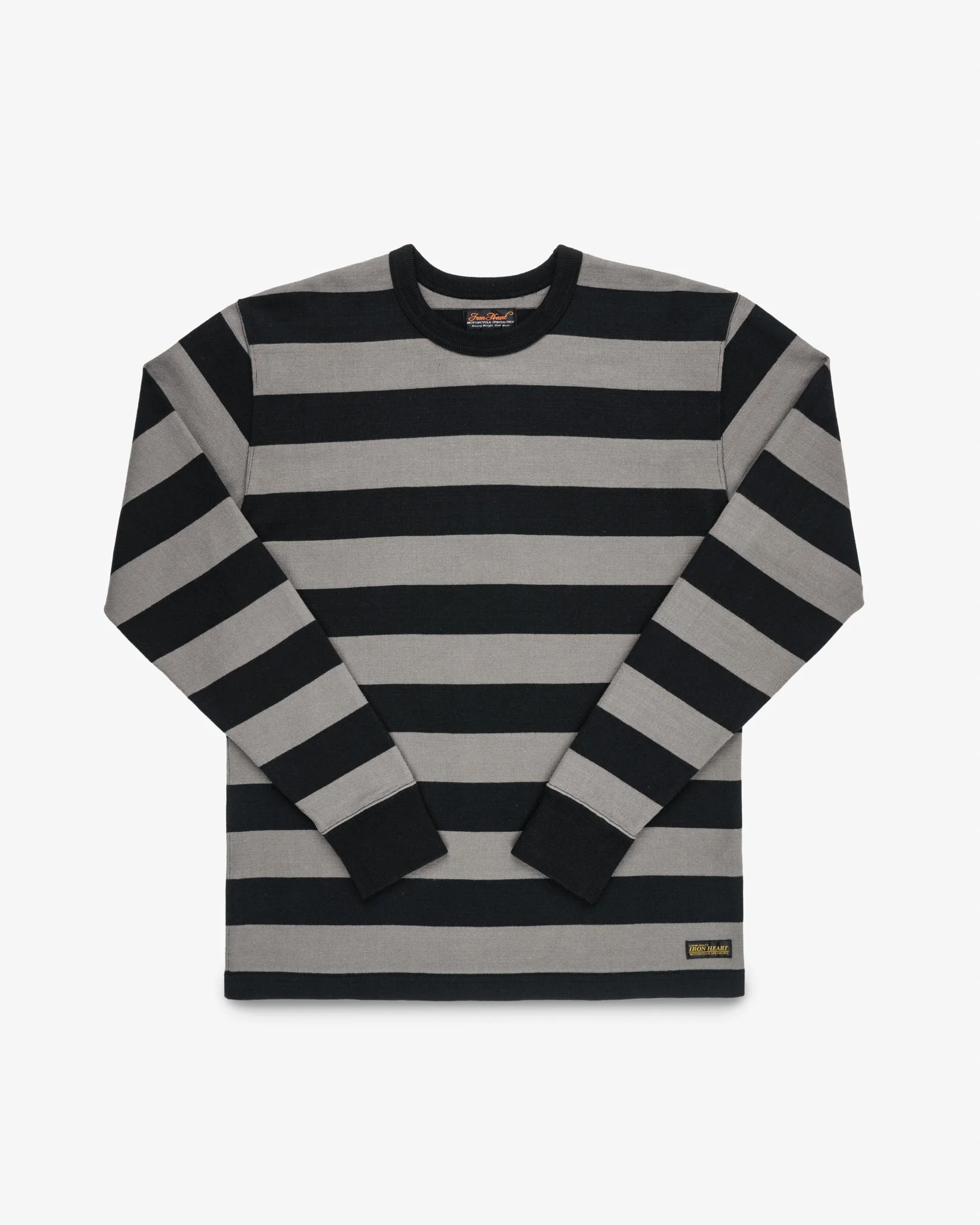 Heavyweight long-sleeved knitted cotton sweater with statement stripes. One-washed to minimize/eliminate shrinkage. So heavy, it's almost rude to call it “just” a sweater. Made In Japan - Designed by Shinichi Haraki, handmade by WORKS INC. in Japan 11oz Japanese Cotton Knit - 100% cotton - Reactive-dyed warp and weft yarns Cut & Construction - Long sleeved sweater/T-shirt - Crew neck - Ribbed collar and elasticated cuffs - Poly/cotton stitching Model Sizing Model Max is wearing Large One-Washed - Post construction, we wash the completed garment in an aggressive industrial washing machine. This process removes virtually all potential shrinkage. - No further shrinkage is expected when washed according to our care guidelines Care Guidelines - We recommend washing this garment at 30°C with a low (or no) spin cycle. Hang dry, do not tumble dry