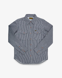 This western-style CPO shirt is made from 12oz sulphur-dyed hickory stripe cotton twill — the same fabric as our longest-running shirt model, the IHSH-07. Because it is woven with sulphur-dyed indigo yarns, you can expect the fabric to fade with wear, developing a wonderful vintage character over time. As the CPO variation of the IHSH-07, this shirt offers a little more length in the body than our standard western cut, with additional side hand-warmer pockets and heavy-duty copper snap fastenings throughout. Made In Japan - Designed by Shinichi Haraki, handmade by WORKS INC. in Japan 12oz Japanese Hickory Stripe - 100% cotton - Twill weave - Indigo sulphur-dyed warp / white weft - This fabric will fade with vintage character through wear and washing Cut & Features - CPO western shirt - Slim fit with slightly longer body - Snap fastenings - Flap down chest pockets - Handwarmer pockets - Western-style front and back yokes - Curved hem Constructional Stitching - Single, double and triple needle stitching - Poly/cotton thread for enhanced strength and durability - Bar tack pocket reinforcements - Chainstitched side seams - Felled internal seams Optional Upgrades This garment is fitted with Iron Heart branded oversized copper snap fastenings. Want to customise? Upgrade with a choice of alternative ‘heavyweight’ snap options when you add to cart Model Sizing - Model Michael is wearing a Large One-Washed - Post construction, we wash the completed garment in an aggressive industrial washing machine. This process removes virtually all potential shrinkage. - No further shrinkage is expected when washed according to our care guidelines Care Guidelines - We recommend washing this garment at 30°C with a low (or no) spin cycle. Hang dry, do not tumble dry