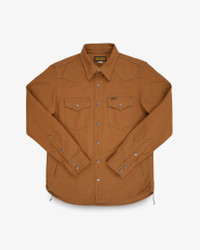 Made In Japan - Designed by Shinichi Haraki, handmade by WORKS INC. in Japan 17oz Japanese Duck Canvas - Brown - 100% cotton - Brown warp and weft - Plain weave - This fabric will slowly fade through wear and washing Cut & Features - CPO western shirt - Slim fit with longer body - Snap fastenings - Flap down chest pockets - Handwarmer pockets - Western-style front and back yokes - Rounded hem with gussets and chainstitch run-off Constructional Stitching - Single and double needle stitching - Poly/cotton thread for enhanced strength - Bar tack pocket reinforcements - Chainstitched side seams - Felled internal seams Optional Upgrades This garment is fitted with Iron Heart branded oversized copper snap fastenings. Want to customise? Upgrade with a choice of alternative ‘heavyweight’ snap options when you add to cart Model Sizing Model Rudi wears Large One-Washed - Post construction, we wash the completed garment in an aggressive industrial washing machine. This process removes virtually all potential shrinkage. - No further shrinkage is expected when washed according to our care guidelines Care Guidelines - We recommend washing this garment at 30°C with a low (or no) spin cycle. Hang dry, do not tumble dry
