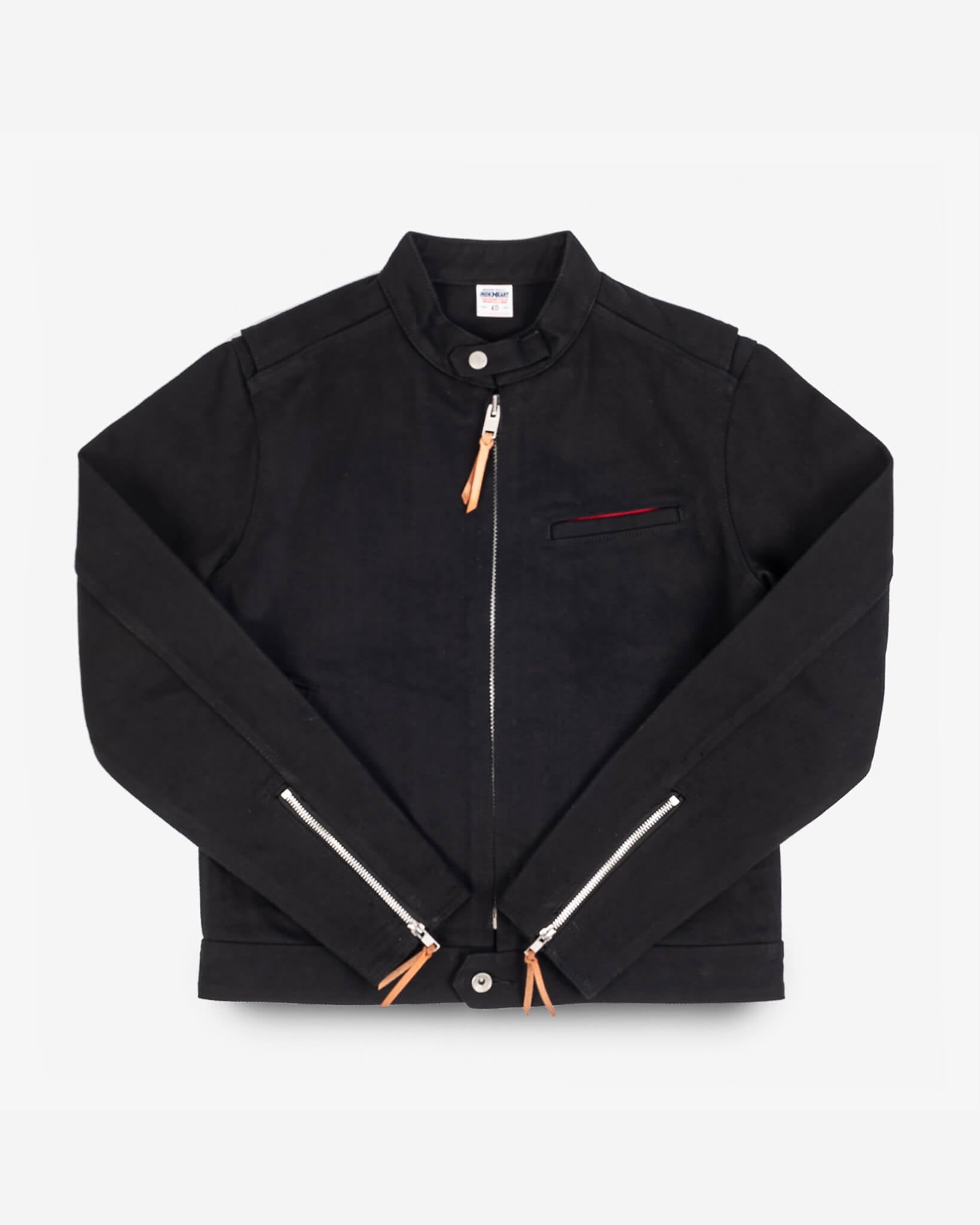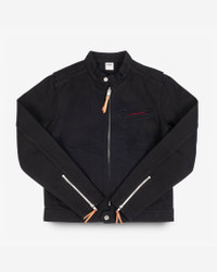 Our traditional rider’s jacket, constructed from 21oz 'Superblack' non-fade Japanese denim. Designed for a streamlined fit to increase wind resistance - this cut features zippered cuffs, a snap fastening collar and a tack button secured hem, with action bi-swing shoulders for increased manoeuvrability. Made In Japan - Designed by Shinichi Haraki, handmade by WORKS INC. in Japan 21oz Japanese Superblack Denim - 100% cotton - Woven with a double twisted weft yarn - Non-selvedge - Black reactive-dyed warp and weft - Right-hand twill weave - Fade-resistant finish to ensure a steadfast colour Cut & Features - Rider's jacket - Designed for a streamlined fit - Action bi-swing pleated shoulders - Overspec’d two-way YKK main zipper - Mandarin collar with snap fastening - Zippered cuffs - Single chest pocket - Twill lined handwarmer pockets - Dual hem cinches with Iron Heart branded tack buttons - Poly/cotton stitching - Single and double needle chainstitch construction - Internal felled seams Model Sizing Model Sam P wears L Sanforized & One-Washed - Sanforization is a post-weave mechanical process which removes most potential shrinkage from a fabric before garment construction - To further reduce the risk of shrinkage, we wash the completed garment in an aggressive industrial washing machine. This process removes virtually all potential shrinkage. - No further shrinkage is expected when washed according to our care guidelines Stretch Details - The waist will stretch out approximately 1" with wear. All other dimensions that are put under pressure will stretch proportionally to the waist Care Guidelines - We recommend washing this garment at 30°C with a low (or no) spin cycle. Hang dry, do not tumble dry