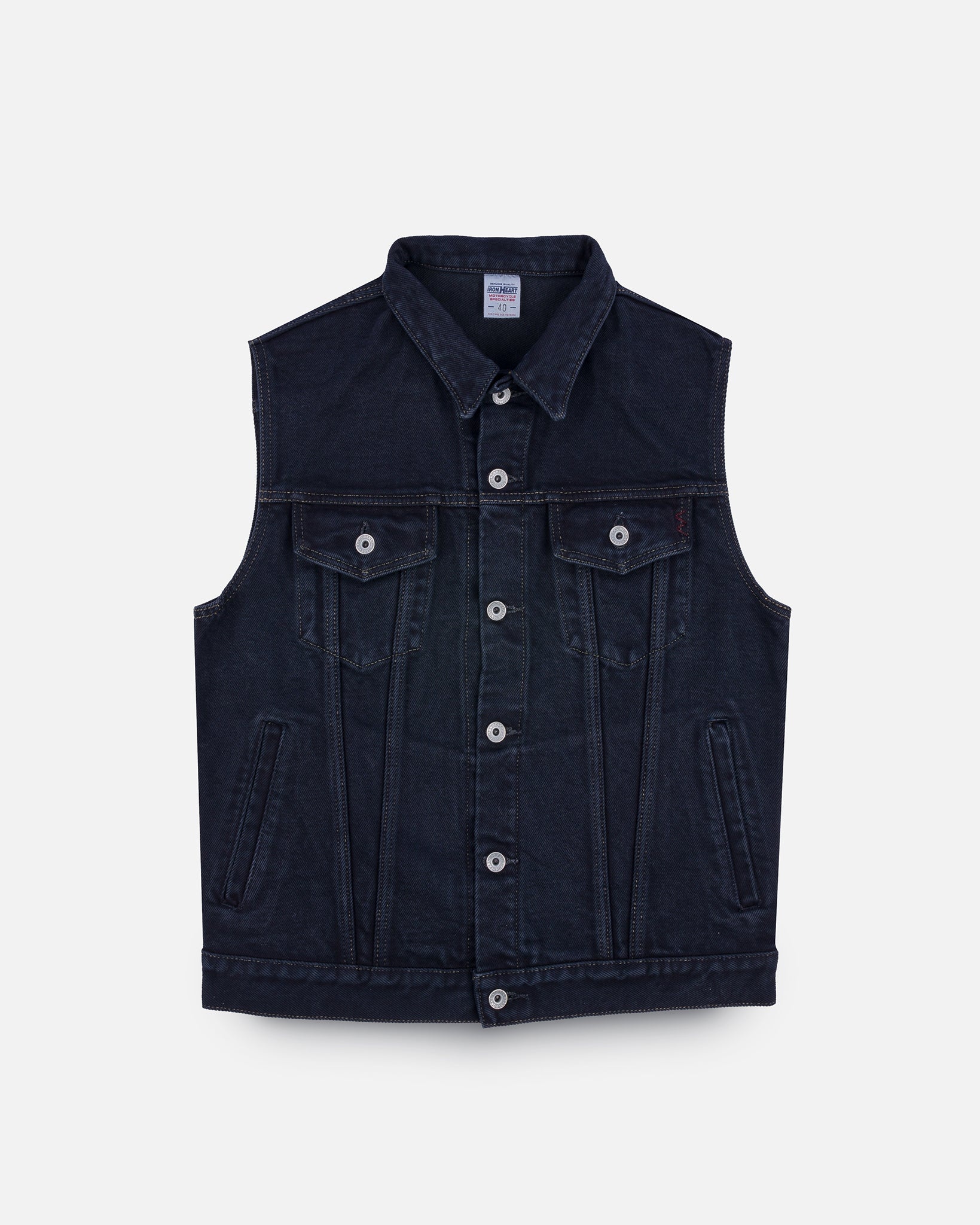 Our "trucker" vest in our super heavy yet super soft 21oz indigo selvedge denim overdyed black. Based on a traditional Type III jacket modified with a slightly longer body and side handwarmer pockets. Iron Heart's first ever overdyed vest (what took us so long?) Made In Japan - Designed by Shinichi Haraki, handmade by WORKS INC. in Japan 21oz Japanese Selvedge Denim - Overdyed Black - 100% cotton - Woven with a double twisted weft yarn - Indigo rope-dyed warp / white weft - Right-hand twill weave - Post-construction, this garment is overdyed using black direct dye - This denim will fade with indigo-tinged hues through wear and washing Type III Vest - Cut & Features - Modified Type III Vest - Two chest pockets with button-down flaps - Hand warmer pockets, the construction of which creates two internal pockets Hardware & Construction - Iron Heart branded tack button fastenings - All felled seam construction - Taped arm openings Model Sizing Model Johnny wears Large Sanforized, One-Washed & Overdyed - Sanforization is a post-weave mechanical process which removes most potential shrinkage from a fabric before garment construction - To further reduce the risk of shrinkage, we wash the completed garment in an aggressive industrial washing machine. - Following this, a high-temperature overdyeing process removes any remaining potential shrinkage - This garment may fit slightly smaller than its non-overdyed counterpart. Please refer to our measurement charts carefully - No further shrinkage is expected if washed in accordance with our guidelines Care Guidelines - We recommend washing this garment at 30°C with a low (or no) spin cycle. Hang dry, do not tumble dry