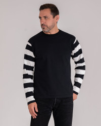 7.5OZ COTTON LONG-SLEEVED CREW NECK BORDER TEE - BLACK BODY WITH STRIPED ARMS