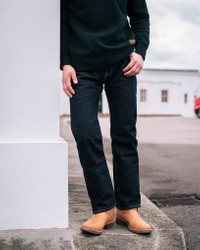 Our relaxed tapered cut jeans, built using 19oz indigo-dyed left-hand twill Japanese selvedge denim. In a left hand twill, the warp gets tightened during the weaving process resulting in a harder, smoother face to the fabric. Often the denim will appear lighter due to more of the weft being visible on the face of the fabric. This 19oz denim has been dipped in indigo many times to achieve a very dark LHT. Made In Japan - Designed by Shinichi Haraki, handmade by WORKS INC. in Japan 888 Relaxed Tapered Cut - Modern tapered styling with a more relaxed fit - Medium/high rise - Roomier fit in the top block and thighs - Pronounced taper from knee to hem - Classic 5-pocket design 19oz Left-Hand Twill Japanese Selvedge Denim - 100% cotton - Woven under high tension to create a stiff fabric with an intense indigo appearance - Indigo rope-dyed warp / white weft - Left-hand twill weave - This denim will fade naturally through wear and washing Hardware & Construction - 4-button fly (extra button added due to the higher rise) - Iron Heart branded tack button at waistband - Works Inc branded pocket rivets - Hidden rivets on rear pockets - Poly/cotton stitching for increased strength - Single and double needle chain stitch construction - Belt loops anchored at three points and sewn into the waistband - Heavy cotton pocket bags and lined rear pockets Selvedge ID - Sideseam, fly, and coin pocket selvedge ID Leather Patch - Heavyweight vegetable-tanned steerhide - Natural finish - Belt-through design - Debossed Iron Heart graphic - Please note: Continued washing (especially at higher temperatures) may cause shrinkage and deformities Unsanforized but One-Washed - This denim has not been sanforized. Sanforization is a post-weave mechanical process that removes most potential shrinkage from a fabric before garment construction - However, unlike our raw, loomstate denim, to reduce the risk of shrinkage, we wash the completed garment in an aggressive industrial washing machine. This process removes virtually all potential shrinkage. - Due to the tight left-hand twill (LHT) weave, little to no furthur shrinkage is expected when washed in accordance to our guidelines - This denim has not undergone a post-weave skewing process, so you will notice leg or arm twist with wear. If you prefer to avoid this characteristic, we recommend exploring our other denim options Stretch Details - The waist will stretch out approximately 1" with wear. All other dimensions that are put under pressure will stretch proportionally to the waist Care Guidelines - We recommend washing this garment at 30°C with a low (or no) spin cycle. Hang dry, do not tumble dry