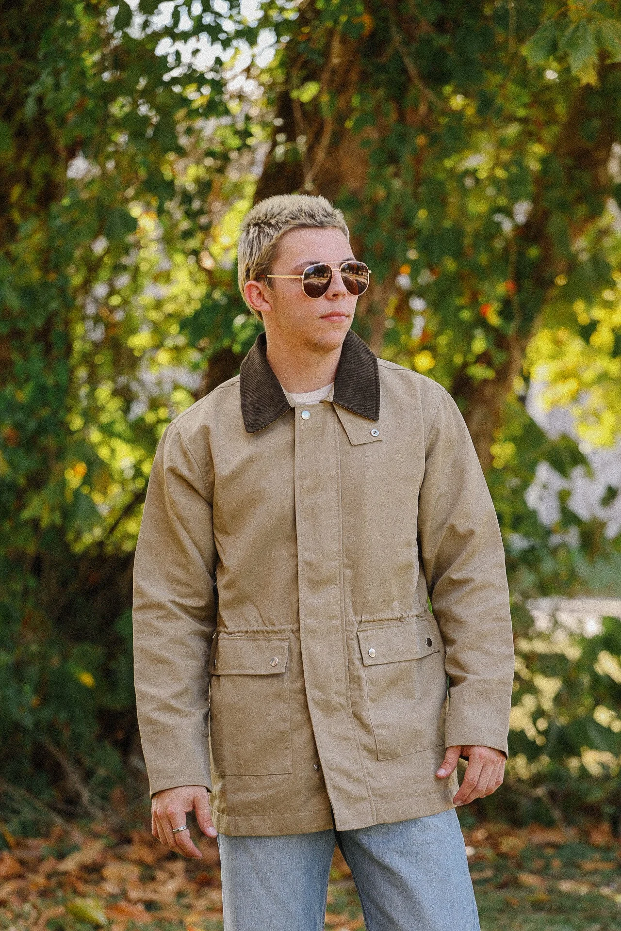 The Country Jacket draws inspiration from classic British countryside outerwear, reimagined with modern materials and detailing. It features a durable waxed nylon shell paired with a soft cotton flannel body lining and smooth cupro-lined sleeves for comfort and ease of movement. Functional elements like the interior waist cinch, throat latch, and corduroy-lined collar and cuffs offer both versatility and timeless style. Finished with sturdy nickel hardware, the Country Jacket combines rugged heritage with contemporary refinement. Made in India. Shell: 100% Nylon Lining: 100% Cotton Sleeve Lining: 100% Cupro - Wax Nylon Shell - Corduroy Facing on Collar and Cuffs - Throat Latch at Collar - Made in India Dan is 6'1 180lbs wearing a M