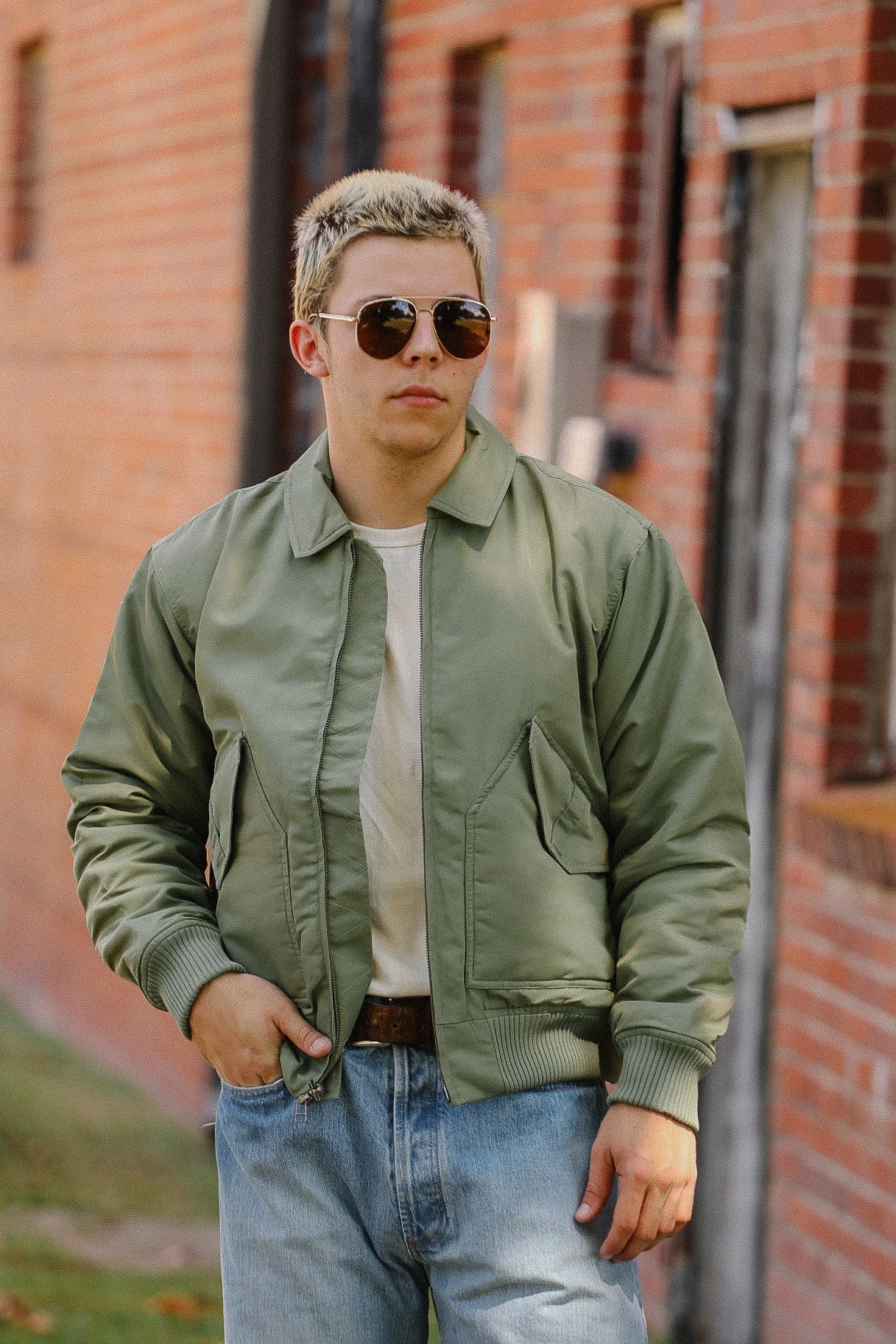 The CWU Flight Jacket offers a refined take on the classic military aviator silhouette, updated with modern materials and a streamlined fit. Crafted from a durable cotton-nylon blend with a soft, brushed texture and matte finish, it’s lined with quilted Tencel for added warmth and comfort. While maintaining the iconic cropped, boxy shape of the original CWU-45P, unnecessary details like the chest patch and sleeve pocket have been removed for a cleaner, more versatile look. Reinforced stitching at the collar allows it to stand naturally, while gunmetal YKK double zippers and heavyweight cotton ribbing at the cuffs and waistband complete the design. Made in India. Shell: 100% Recycled Nylon Lining: 100% Tencel Ribbing: 100% Cotton Dan is 6'1 180lbs wearing a M