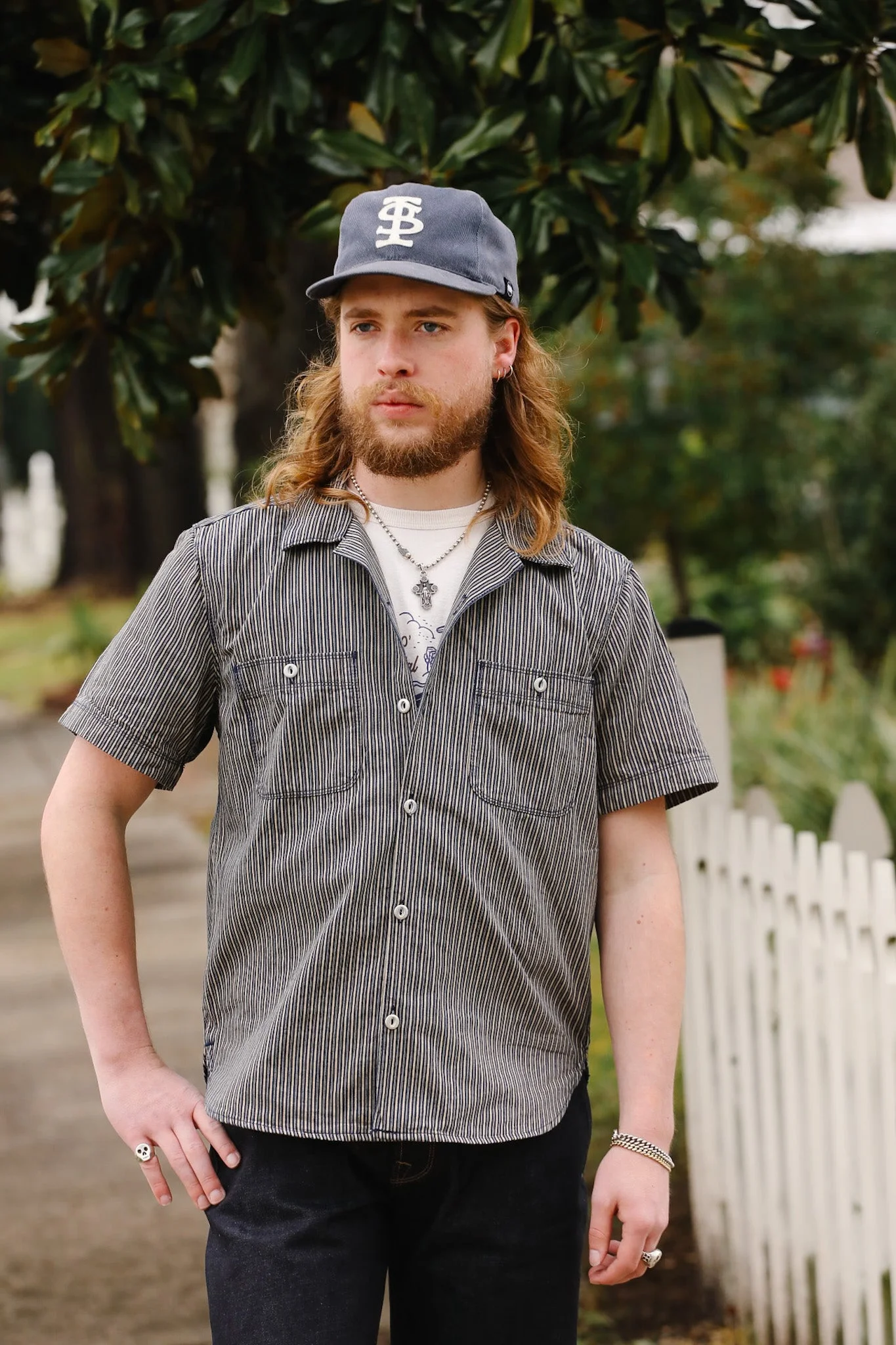 Cut with an easy camp collar, this Dayton is made from a 7oz indigo stripe fabric woven in Japan, offering a balanced weight with rich color and subtle texture that will evolve beautifully over time. Bias-cut chest pockets and back yoke enhance both durability and visual depth, while precise 1/8” double-needle stitching reinforces the shirt throughout. Authentic workwear details round out the design, including Japanese aluminum repro fisheye buttons, classic thread run-offs at the bottom gusset, and custom labels made in the USA. Fully rinsed and preshrunk for comfort and consistent fit, the Dayton Shirt is crafted from 100% cotton and sewn in the USA, making it a refined yet easygoing staple built for everyday wear. - Custom 7-ounce indigo stripe from Japan - Camp collar - 1/8” double needle stitch detail, bias cut pockets and back yoke - Aluminum metal repro fisheye buttons from japan, thread runoffs on bottom gusset - Custom labels from USA - Rinsed, preshrunk - 100% cotton - Sewn in usa Duncan is 5'10 150lbs wearing a M