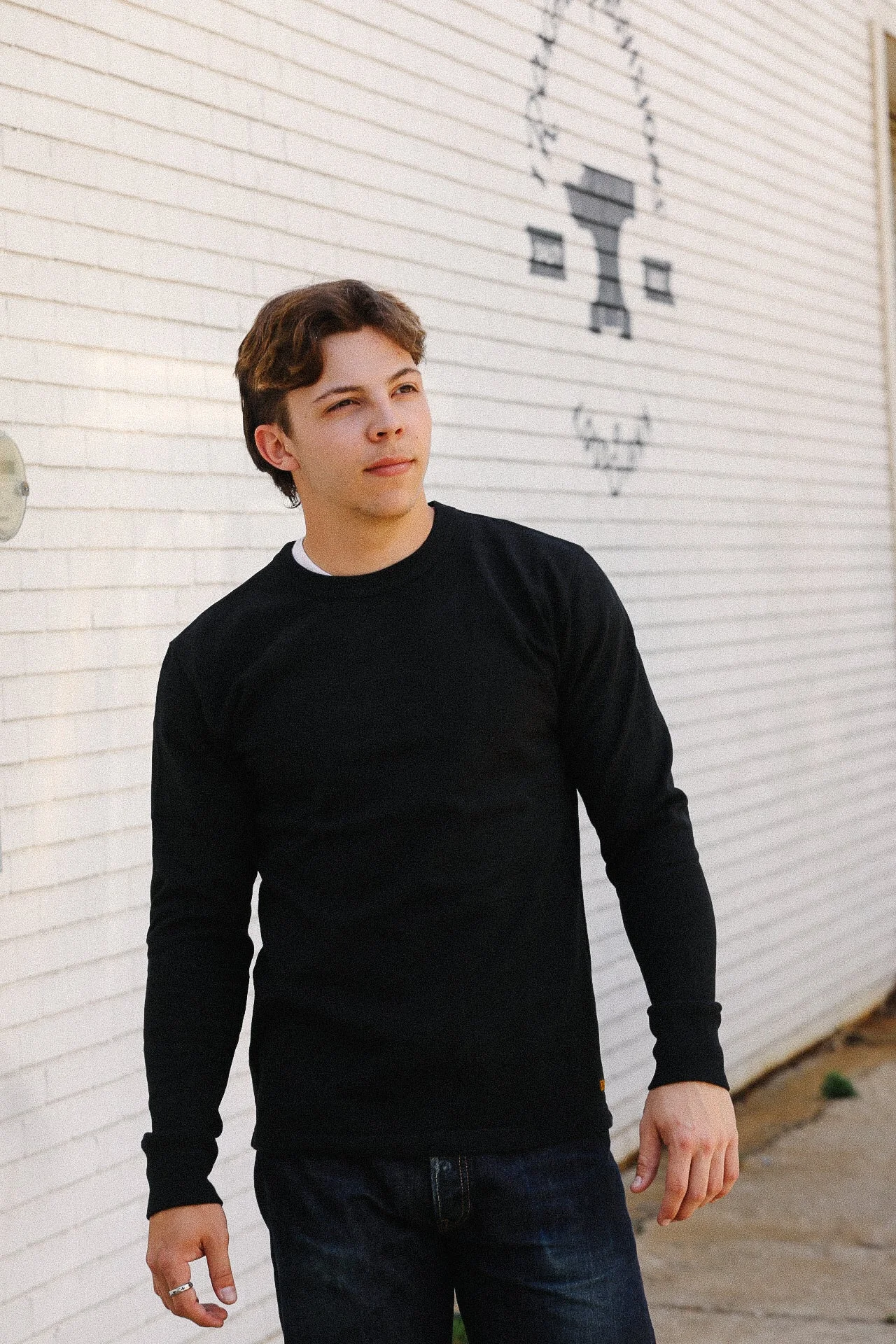 IHTL-1501-BLK Originally designed by Haraki-san as a long-sleeved tee, calling this a T-shirt would be a huge understatement. Made from an 11oz cotton knit fabric and finished with a heavy-duty ribbed crew neck and cuffs, the result is a supremely comfortable, highly durable garment, with increased heat retention due to the heft of the weave. Featuring a heavy-duty ribbed crew neck and cuffs, this versatile layering piece can be worn year-round as either a long-sleeved T-shirt, a thermal underlayer or a lightweight sweater. - Made in Japan - 11oz 100% cotton knit fabric - Long sleeved crew neck sweater - Ribbed collar and cuffs - Size Large sweater weighs just over 1.1lbs (0.5kg) - One washed, so minimal or no shrinkage to be expected Josh is 5'7 195lbs wearing a 2X Daniel is 6'1" 185lbs and wears a size L.