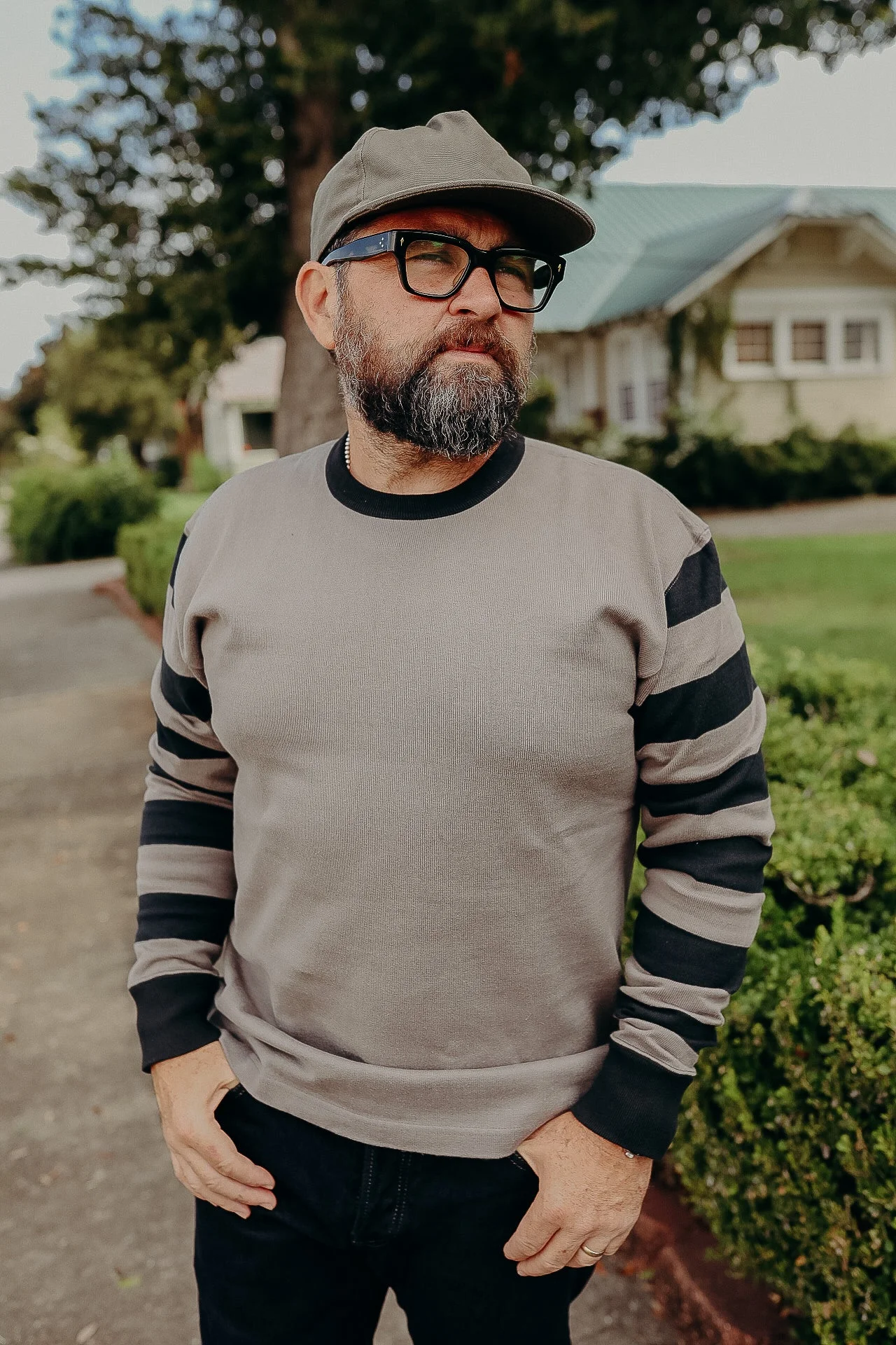 IHTB-12-GRY Originally designed by Haraki-san as a long-sleeved tee, calling this a T-shirt would be a huge understatement. Made from an 11oz cotton knit fabric and finished with a heavy-duty ribbed crew neck and cuffs, the result is a supremely comfortable, highly durable garment, with increased heat retention due to the heft of the weave. Featuring a heavy-duty ribbed crew neck and cuffs, this versatile layering piece can be worn year-round as either a long-sleeved T-shirt, a thermal underlayer or a lightweight sweater. Josh is wearing an XL - Made in Japan - Long-sleeved T-shirt / lightweight sweater - 11oz cotton knit fabric - Grey body - Black & Grey striped arms - Classic crew neck - Ribbed collar and elasticated cuffs - One washed - no shrinkage to be expected