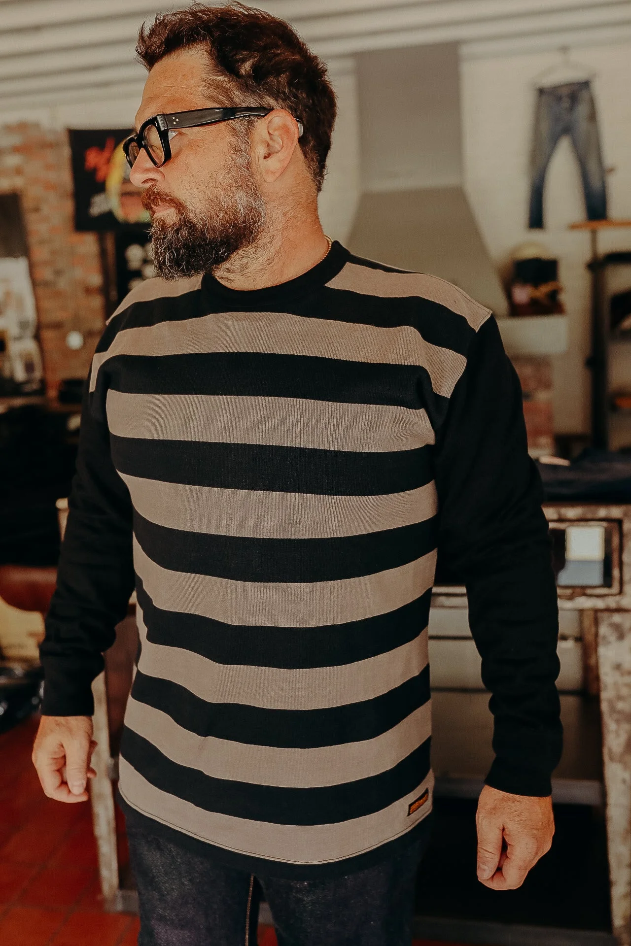 IHTB-05-GRY Originally designed by Haraki-san as a long-sleeved tee, calling this a T-shirt would be a huge understatement. Made from an 11oz cotton knit fabric and finished with a heavy-duty ribbed crew neck and cuffs, the result is a supremely comfortable, highly durable garment, with increased heat retention due to the heft of the weave. Featuring a heavy-duty ribbed crew neck and cuffs, this versatile layering piece can be worn year-round as either a long-sleeved T-shirt, a thermal underlayer or a lightweight sweater. Josh is wearing a XL - Made in Japan - Long-sleeved T-shirt / lightweight sweater - 11oz cotton knit fabric - Stripe body - Black arms - Classic crew neck - Ribbed collar and elasticated cuffs - One washed - no shrinkage to be expected