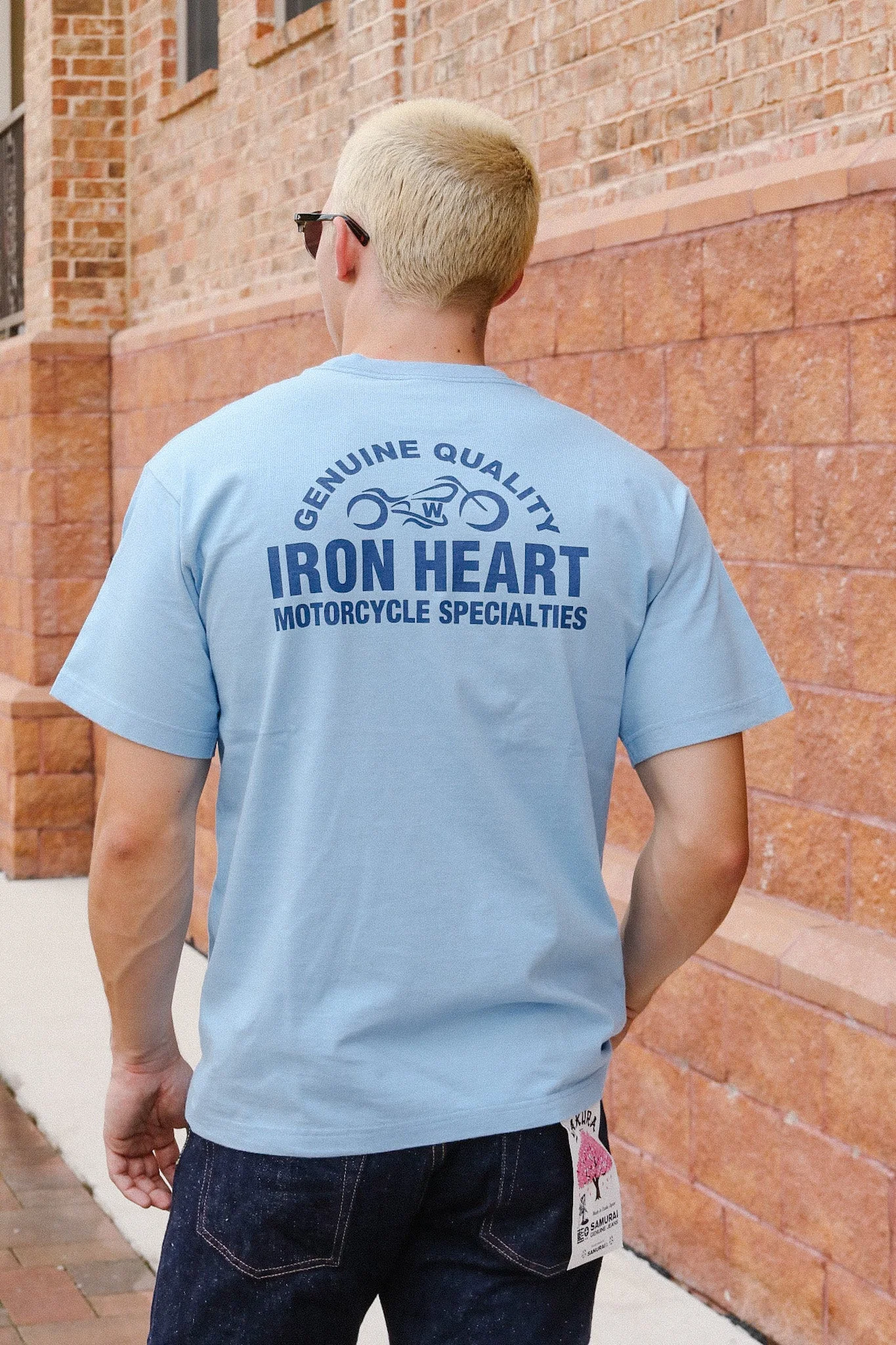 IHT-2504-SAX 7.5oz loopwheel cotton t-shirt, finished with an Iron Heart chest and back print. Made from 100% cotton, the loopwheeled fabric is knitted on vintage "tsuriam-ki" machines in Wakayama, Japan - one of only two factories in the world still manufacturing authentic loopwheel cloth. This low-tension, circular knitting technique produces very soft, tubular pieces of fabric, allowing for a garment to be constructed without any side seams. Each T-shirt is then cut, sewn and printed in the historic Shitamachi (“Old Town”) district of Tokyo. - Made in Japan - Short sleeved t-shirt - 7.5oz Japanese loopwheel cloth - Screen printed Iron Heart logos on the chest and back - Knitted on vintage loopwheel machines in Wakayama, Japan - Cut, sewn and printed in Tokyo old town - Tube construction - no side seams - Crew neck - One washed - no shrinkage to be expected Dan is 6'1 180lbs wearing a L
