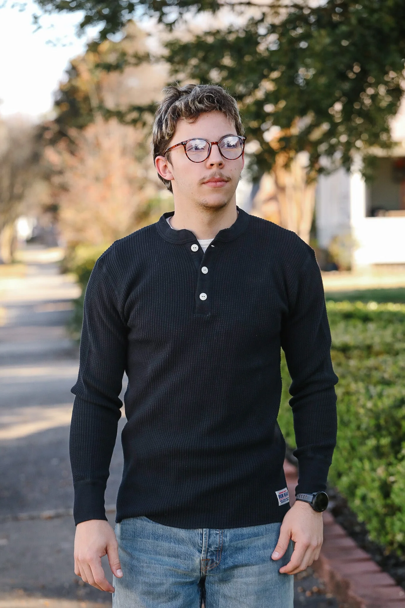 IHTL-1213-BLK WAFFLE KNIT LONG SLEEVED THERMAL HENLEY - BLACK