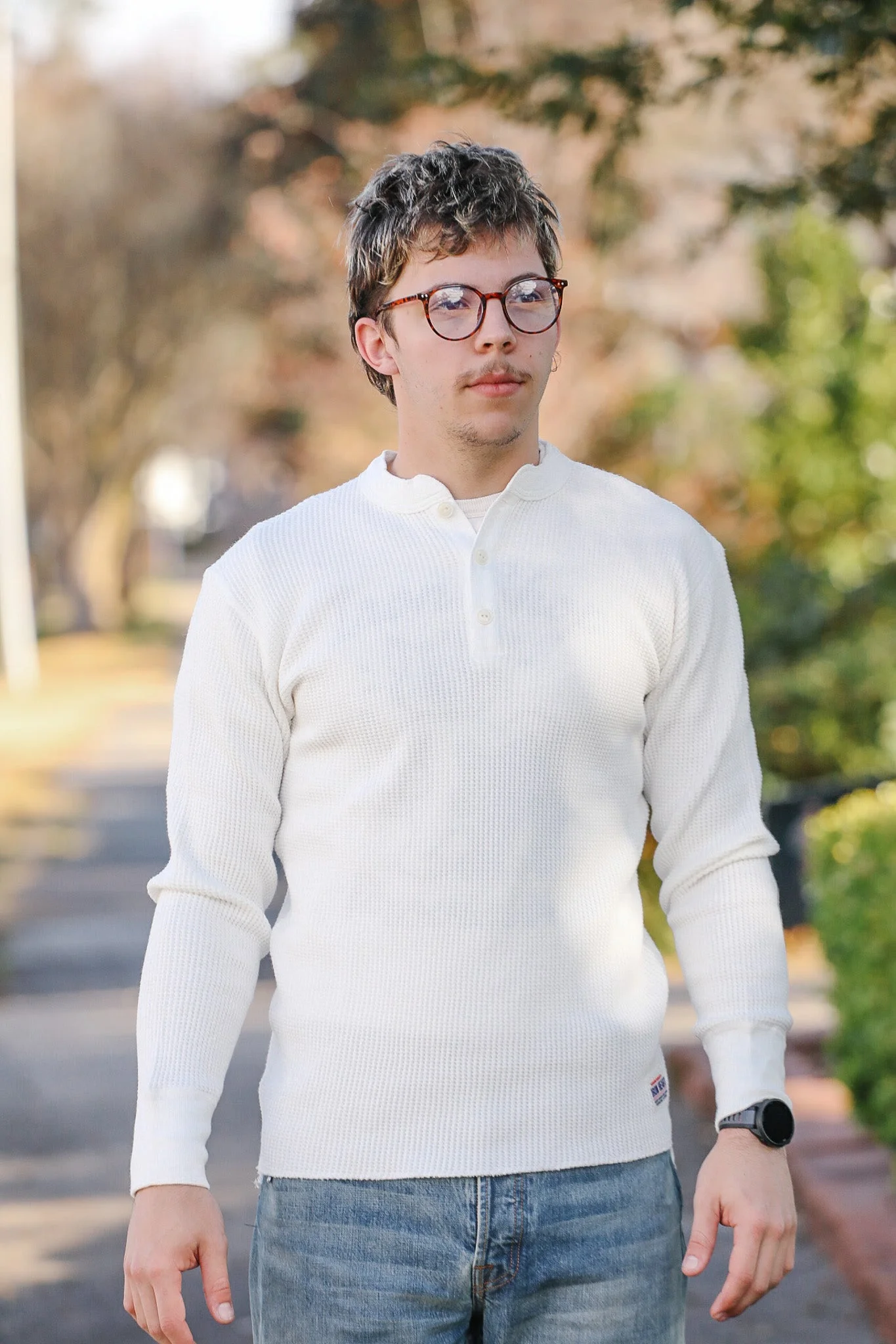 Classic, functional, versatile, and hardwearing. Soft, thick, warm, and comfortable. This long sleeved cotton waffle knit thermal Henley can't be beaten. - IHTL-1213 - Made in Japan - Long sleeved thermal Henley - 100% cotton waffle thermal knit - All seams are 4 needle flat seam construction - Cat's eye buttons - Chainstitch run-off on sleeves and hem - Due to the stretchiness of the fabric, there will be some variation in sizing - One washed, so minimal shrinkage Dan is 6'1" 180lbs wearing a L.