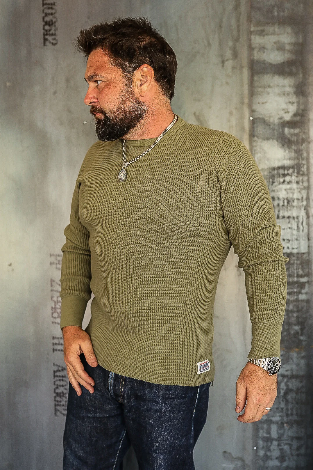 IHTL-1301-OLV Soft, thick, warm, and comfortable. Classic, functional, versatile, and hardwearing. This long sleeved cotton waffle knit thermal crew neck is a favourite. - Made in Japan - Long sleeved thermal crew neck - Cotton waffle thermal knit - All seams are 4 needle flat seam construction - Chainstitch run-off on sleeves and hem - Due to the stretchiness of the fabric there will be some variation in sizing - One washed, so minimal or no shrinkage to be expected Josh is 5'7 200 wearing XL