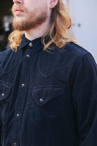An indigo overdyed Black corduroy shirt is defined by its distinctive curved yoke and pocket design. The fine-wale corduroy gives the shirt a clean, refined look, while the soft and supple hand makes it comfortable and well suited for layering as an inner piece. The Indigo Black version is created by overdyeing the standard indigo model with black dye, resulting in a deeper, richer tone with added depth. - 100% Cotton - Indigo Overdyed Black Corduroy - Western Yokes - Embossed Leaf Motif Snap at Neck - Made in Japan