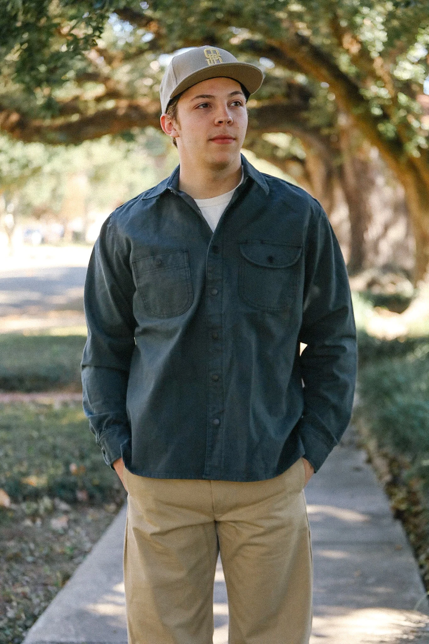 The Dyed Canvas Work Shirt is built from a sturdy 11oz selvedge canvas woven in Japan and roll-dyed in Los Angeles for a rich, lived-in character. Designed with durability in mind, it features triple-needle chainstitched side seams with classic run-off details, a selvedge-cut placket, and two large utilitarian chest pockets. Finished with blackened brass snaps and a natural herringbone locker loop, this work shirt blends rugged construction with refined craftsmanship — proudly sewn in Los Angeles. - 11oz 100% cotton selvedge canvas from Japan - Dyed in Los Angeles - 2 large chest pockets - Triple needle chainstitched side seams w/ run-off - Placket cut on selvedge - Blackened brass snaps - Natural herringbone locker loop - Sewn in Los Angeles Dan is 6'1 180lbs wearing a L