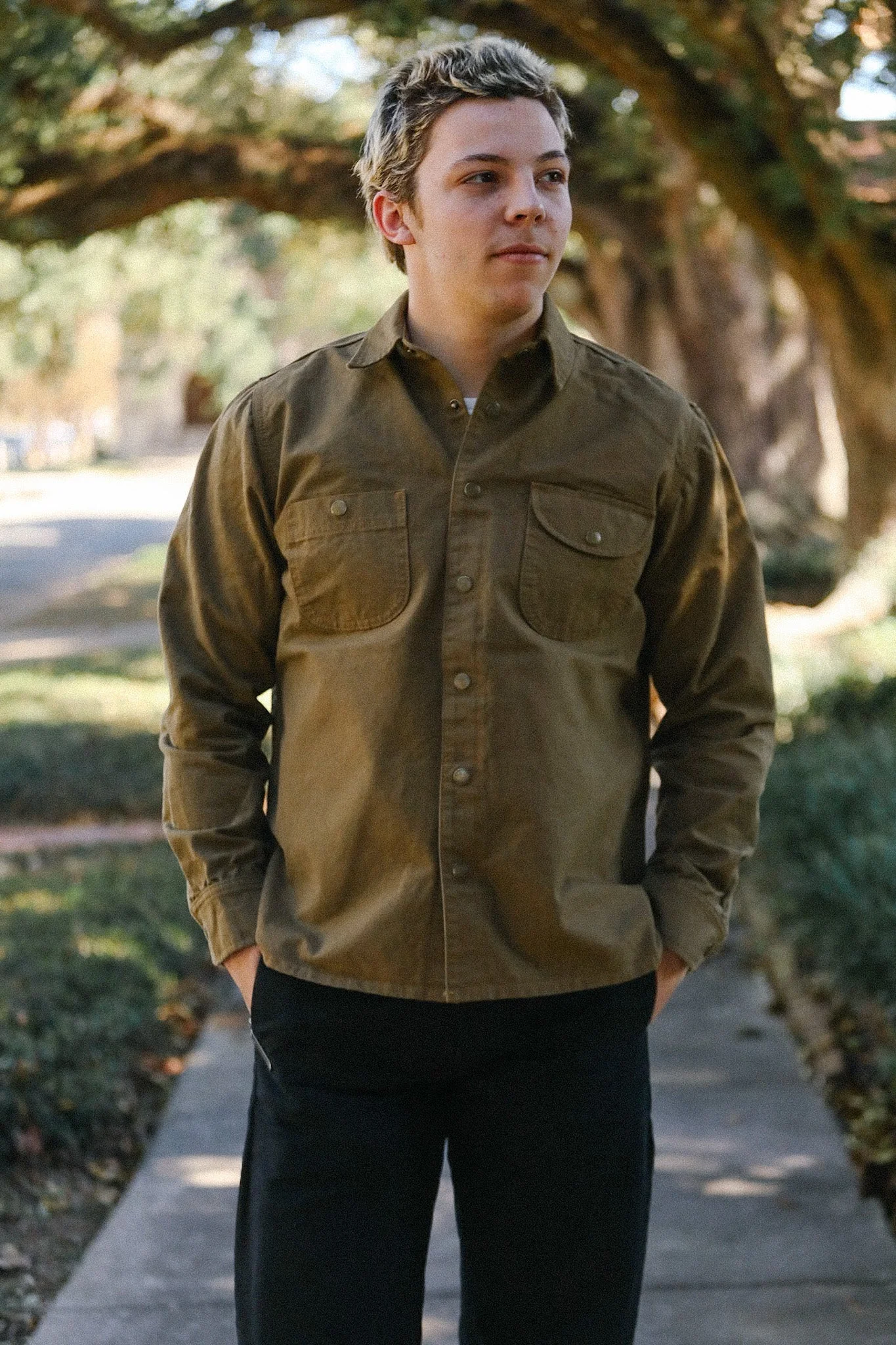 The Dyed Canvas Work Shirt is built from a sturdy 11oz selvedge canvas woven in Japan and roll-dyed in Los Angeles for a rich, lived-in character. Designed with durability in mind, it features triple-needle chainstitched side seams with classic run-off details, a selvedge-cut placket, and two large utilitarian chest pockets. Finished with antiqued brass snaps and a natural herringbone locker loop, this work shirt blends rugged construction with refined craftsmanship — proudly sewn in Los Angeles. - 11oz 100% cotton selvedge canvas from Japan - Dyed in Los Angeles - 2 large chest pockets - Triple needle chainstitched side seams w/ run-off - Placket cut on selvedge - Antiqued brass snaps - Natural herringbone locker loop - Sewn in Los Angeles Dan is 6'1 180lbs wearing a L