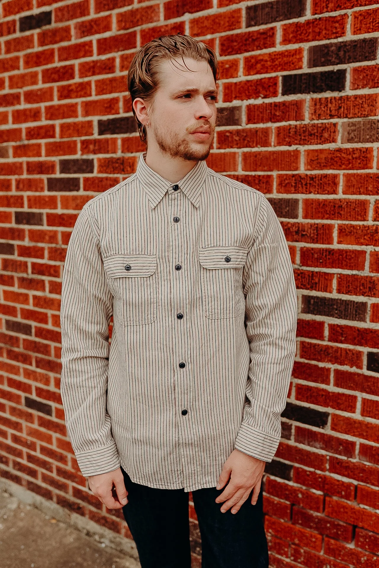 The fabric is a multi-stripe with 20-count stripes and 10-count for the dotted lines, which resemble selvedge. The result is an easy-to-wear tricolor work shirt with 3 warp colors and 1 weft color - Dual chest pockets - Triple needle construction - Urea buttons *Duncan is 5'10 150lbs wearing a size Medium