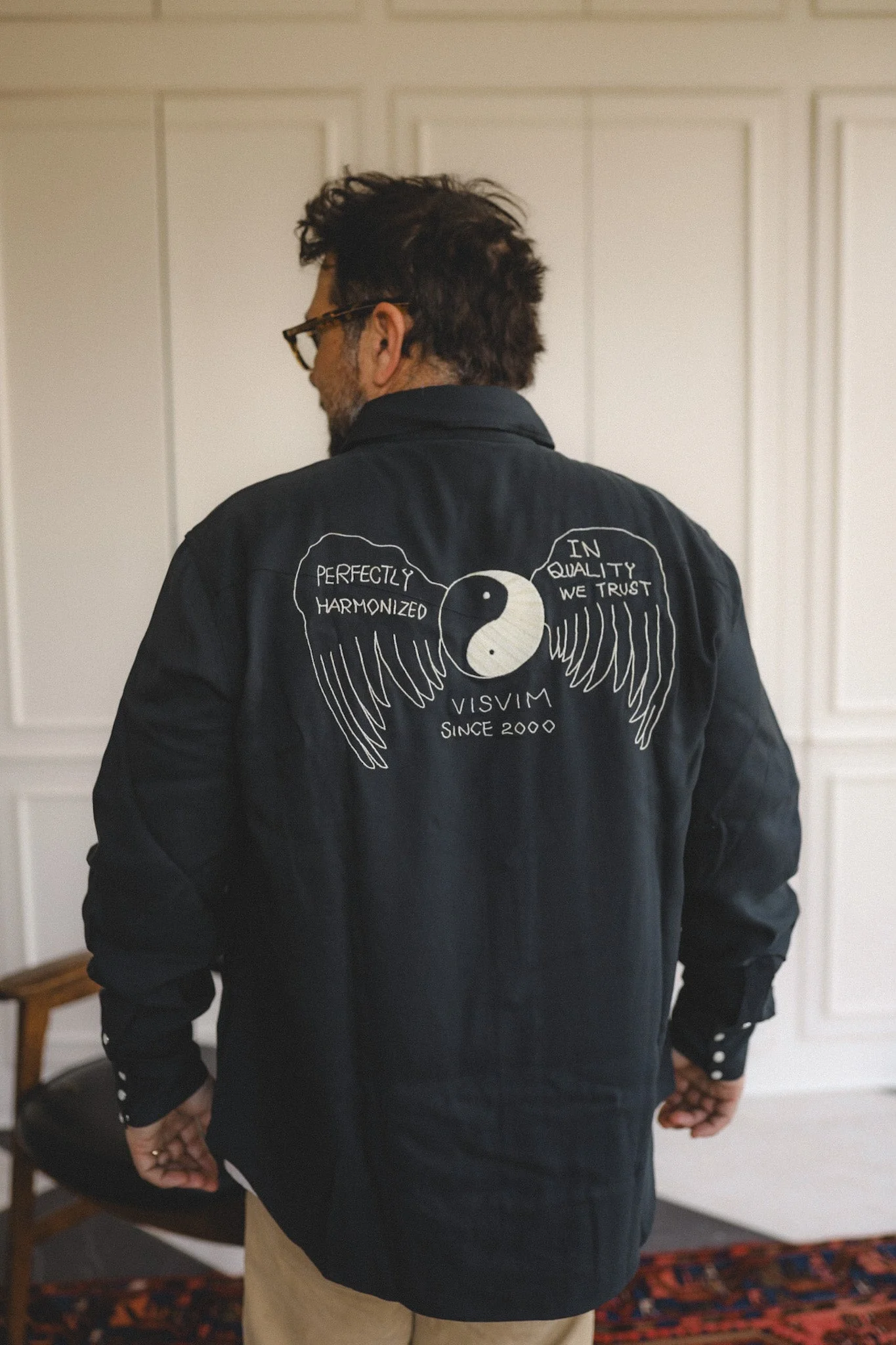 Item Code: 0126105011008 The Visvim Four Corners Long Sleeve Shirt is a refined western-inspired piece crafted from 100% rayon, chosen for its fluid drape and smooth hand. Lightweight and breathable, the fabric gives the shirt an easy movement and subtle sheen that elevates its relaxed silhouette. Designed with classic snap styling, it features pearl snap closures at the front and cuffs, along with two chest flap pockets that ground the piece in traditional workwear roots. Embroidered branding sits neatly above the front pocket, while a detailed embroidered motif across the back adds depth and character without overwhelming the design. Finished with long sleeves and a straight hem, the Four Corners Shirt balances craftsmanship and understated statement—an effortless layer that carries both texture and presence. - 100% Rayon - Western Yokes - Pearl Snap Closure - Visvim Embroidery on Front and "Harmony" Motif on Back - Made in Japan Josh is 5'7 190lbs wearing a 4