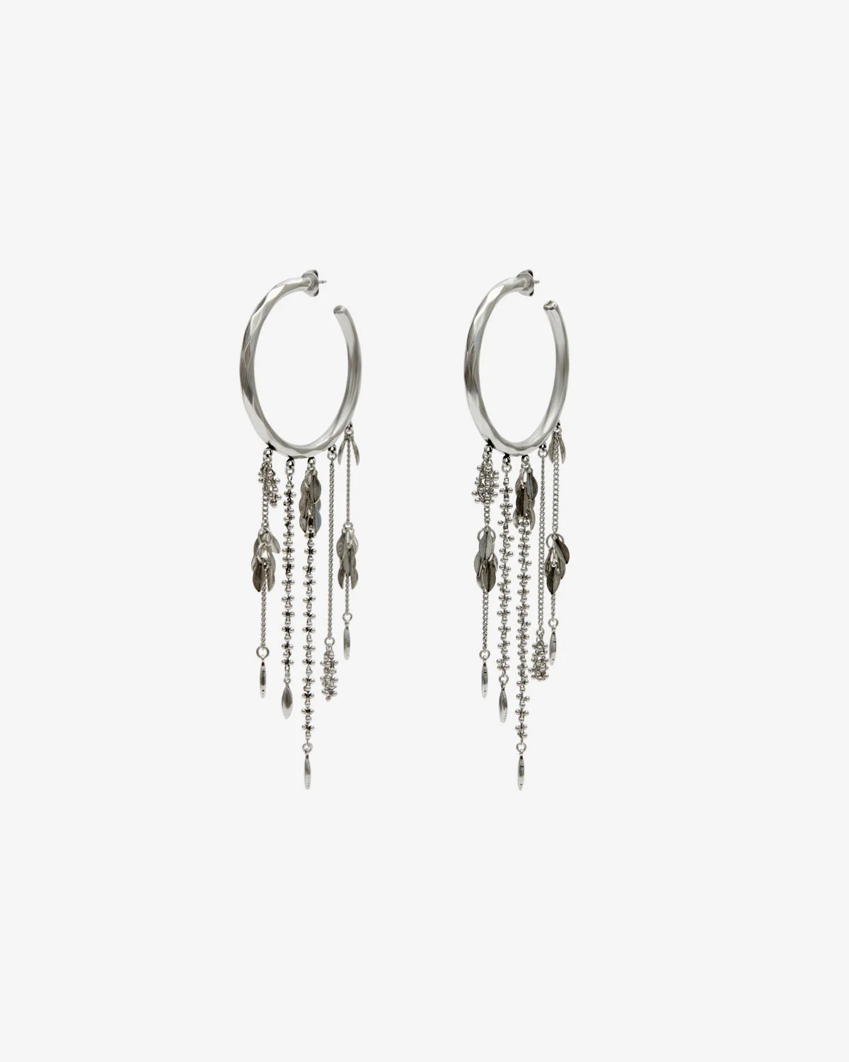 Faceted silver-finish brass hoop earrings with decorative chains, tassels, and "Isabel Marant" engravings Clasp with pin and push back Length: 13 cm (5.1 in.) / Height 4.5 cm (1.8 in.) Style: BL0278FAD1B16B08SI ALEX 100% brass