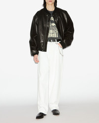 Lambskin leather bomber style jacket Round neck Done up with a zipper and snap buttons Long sleeves Piped side pockets Ribbed finishes on the collar, cuffs, and waist Quilted lining Inside pocket Cropped ball-shaped cut Style: VE0551HAC3B02H01BK BLAIKE 100% lambskin leather