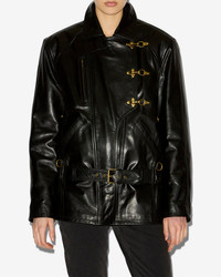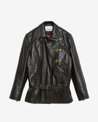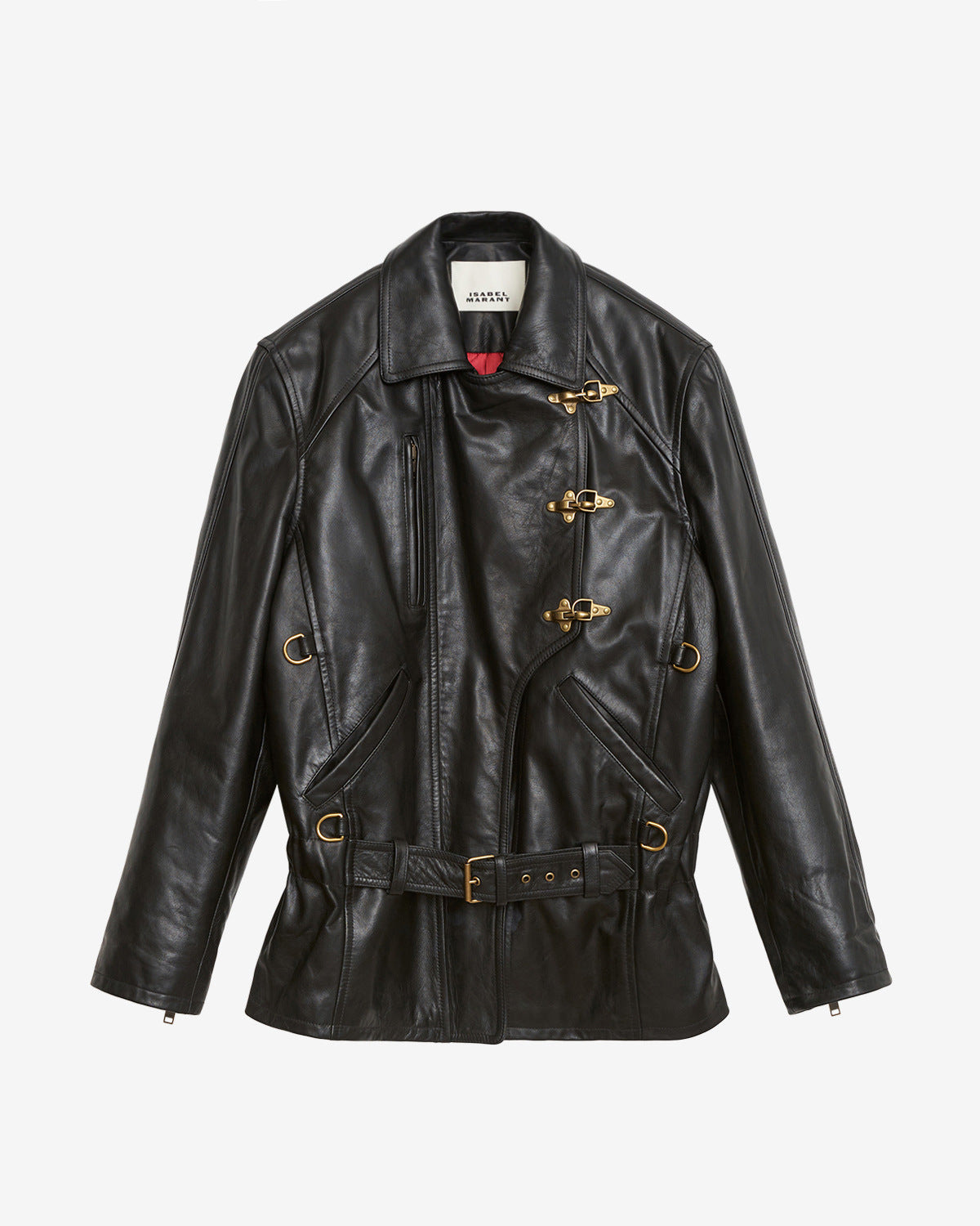 Biker style leather jacket Shirt collar Shoulder yokes Long sleeves with zippered cuffs Crossover front with snap hooks and a hidden zipper Zippered chest pocket Side pockets Side tabs with a ring Waistband with loops Metal buckles and eyelets Gathered back Contrasting quilted lining Straight cut with belt Style: VE0537FAC3B01I01BK CAITLYN 100% bovine leather