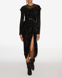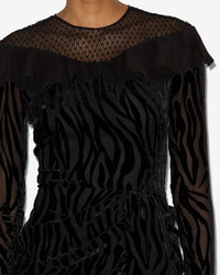 Midi zebra pattern burnout velvet wrap dress Round neckline with fishnet yoke Silk crepe ruffles on the upper chest Long sleeves with slit cuffs Fitted waist and draped skirt with slit Fitted cut Style: RO0897FB-C4J24I CAMY 64% viscose, 36% silk