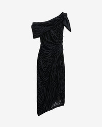Midi asymmetrical zebra pattern burnout velvet wrap dress Off-the-shoulder style with bows Sleeveless Draped waist Flowing asymmetrical slit skirt Style: RO0909FB-C4J24I CYANE 64% viscose, 36% silk