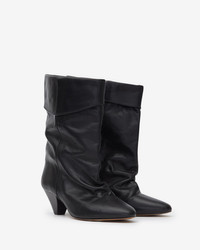 Draped boots in calfskin leather Soft turn-down uppers Pointed toes Laminated leather cone heels Soft leather insoles and outsoles Soft leather lining Heel height: 5.5 cm / 2.2 in. Style: BO0188FAC1A19S01BK DALBY 100% calfskin leather