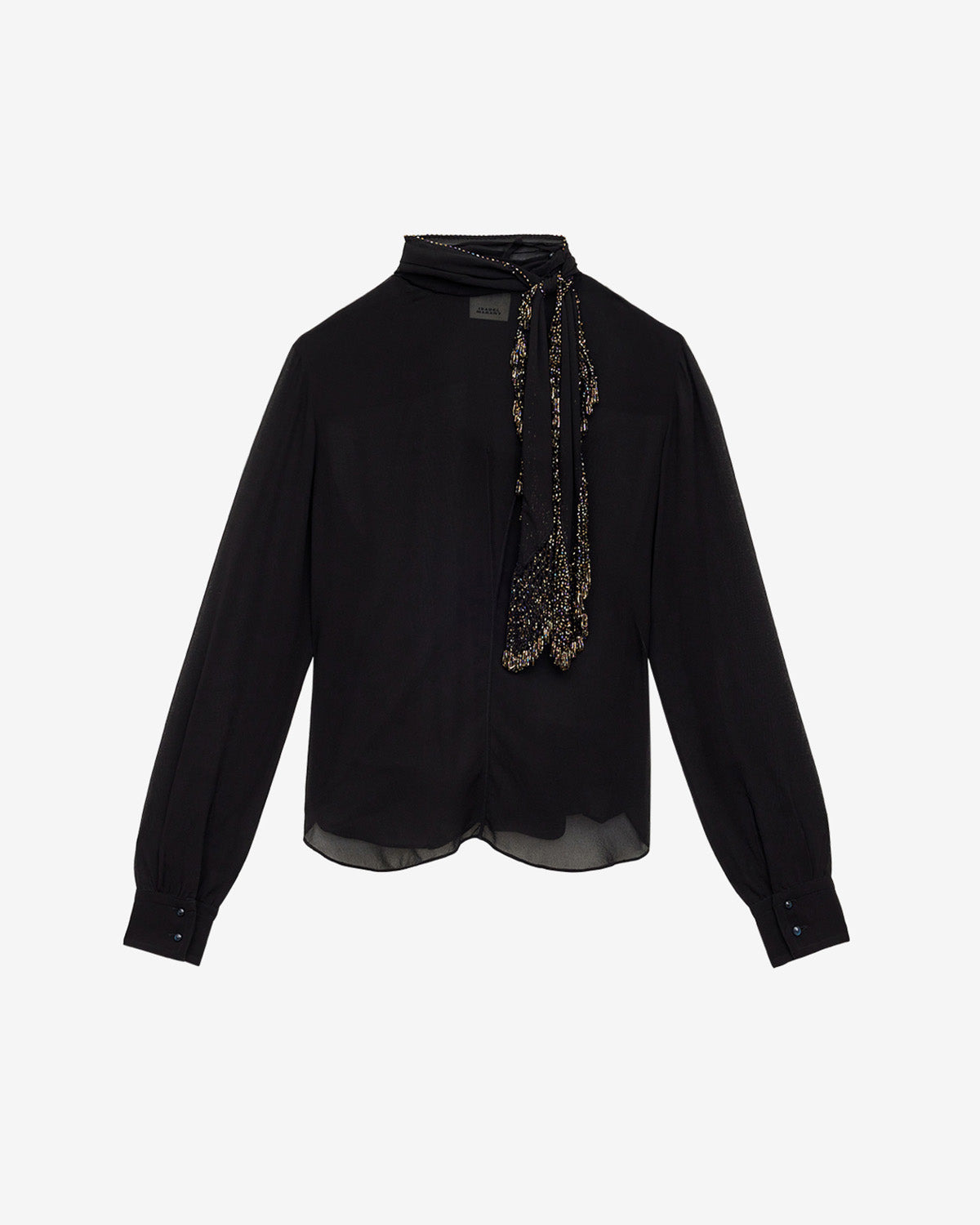 Sheer silk georgette blouse Elaborate pussy bow collar with beaded crochet embroidery Long sleeves with buttoned cuffs Inverted rear pleat and rounded hem Relaxed fit Style: HT0727FA-C4J16I ELAURA 100% silk